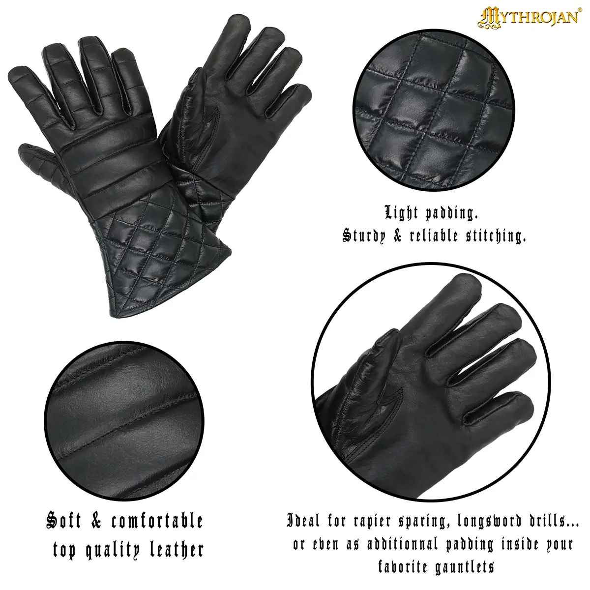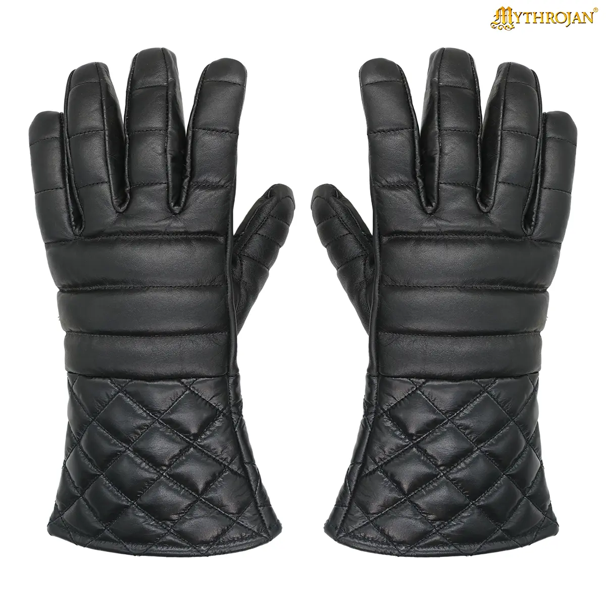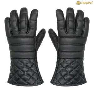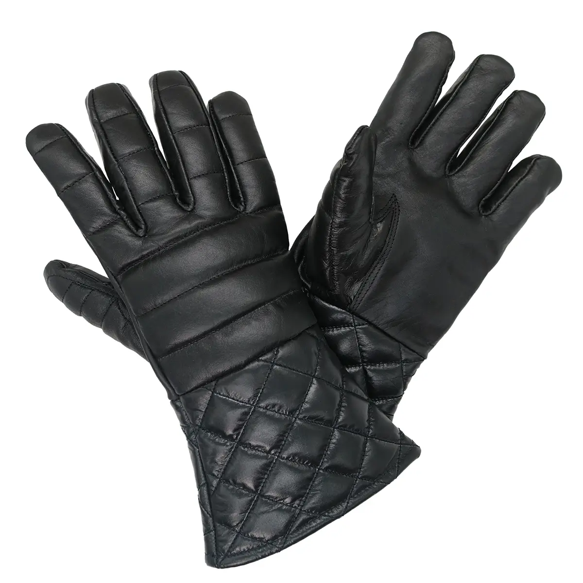 Crafted from genuine leather, they offer a protective barrier without sacrificing mobility. The light padding enhances shock absorption for rapier work or controlled longsword sparring, while the quilted diamond-stitched cuffs give a nod to traditional aesthetics. Their broad, wrist-length design allows a secure yet flexible fit, keeping your movements natural during drills or roleplay.