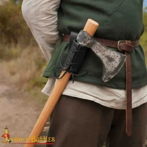 The frog has an adjustable leather lace at the front, so that it fits different blade widths easily. This makes it suitable as a dagger frog or an axe frog, depending on your equipment. The rear belt loop is reinforced with antique brass rivets, for a secure fit on belts.