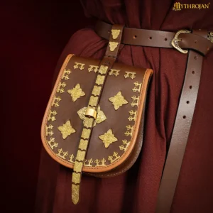 The bag closes securely with a long leather strap and brass clasp, keeping your valuables safe whether you’re attending a fair or historical event. Its sturdy construction ensures durability, while the decorative brass details add unmistakable character to any Viking or early medieval outfit.