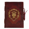 Journaling notebook in genuine leather with lion crest, 110 handmade pages and secure tie closure for travel and daily writing.