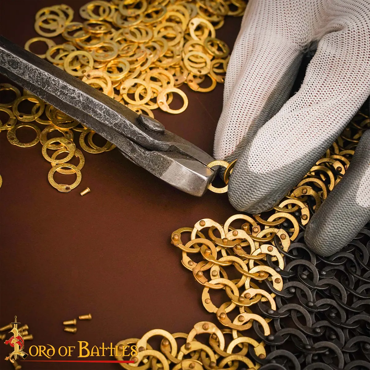 Each ring is pre-punched with a rivet hole, perfectly aligned to fit the included brass rivets, making your chainmail assembly faster and more reliable. Once riveted, the rings lock securely, producing a strong and resilient mail pattern capable of withstanding handling for reenactments, LARP combat, or stage performances. Their warm golden brass finish adds not only durability but also visual richness, giving your armor or costume a striking edge.