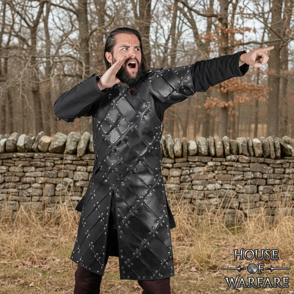 This Lord of the North Leather Brigandine follows that concept. The armor has overlapping leather plates riveted onto a strong leather base, for a protective yet flexible structure. The design allows the wearer to move comfortably while maintaining the look of traditional medieval armor.