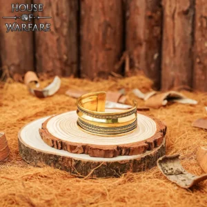 The Medieval Brass Bracelet has ornate borders framing a polished central band, highlighting the skill of the craftsman and giving the piece a refined appearance. Its warm golden look reflects wealth and style, making it a perfect addition for anyone who values both history and beauty.