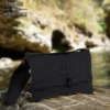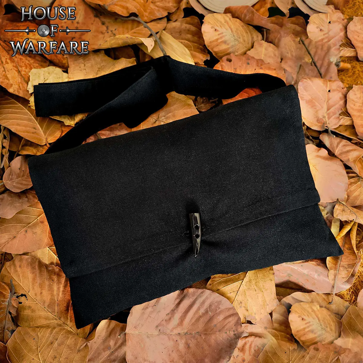 While walking in the shadows, keep your important items at hand with the Medieval Canvas Shoulder Bag in black at a LARP event or Renaissance faire. This cotton canvas bag features a front flap and fastens with a triangular horn toggle. It has a rectangular shape. The long shoulder strap is a fixed length. Its streamlined appearance will not detract from a decorative or modern outfit. This accessory also works wonderfully at fantasy events or historical conventions.