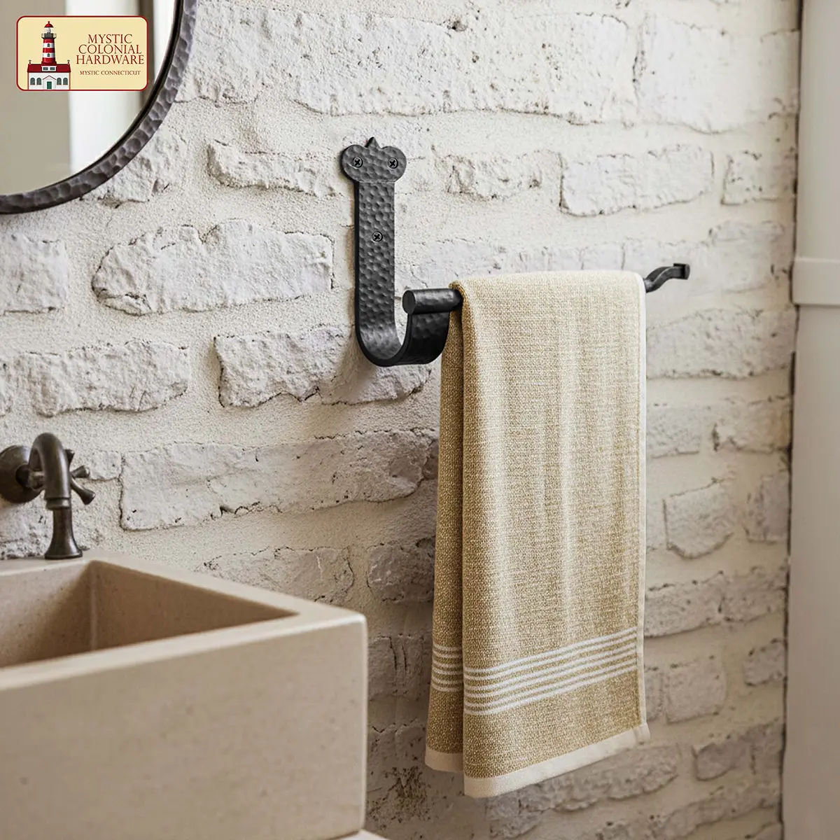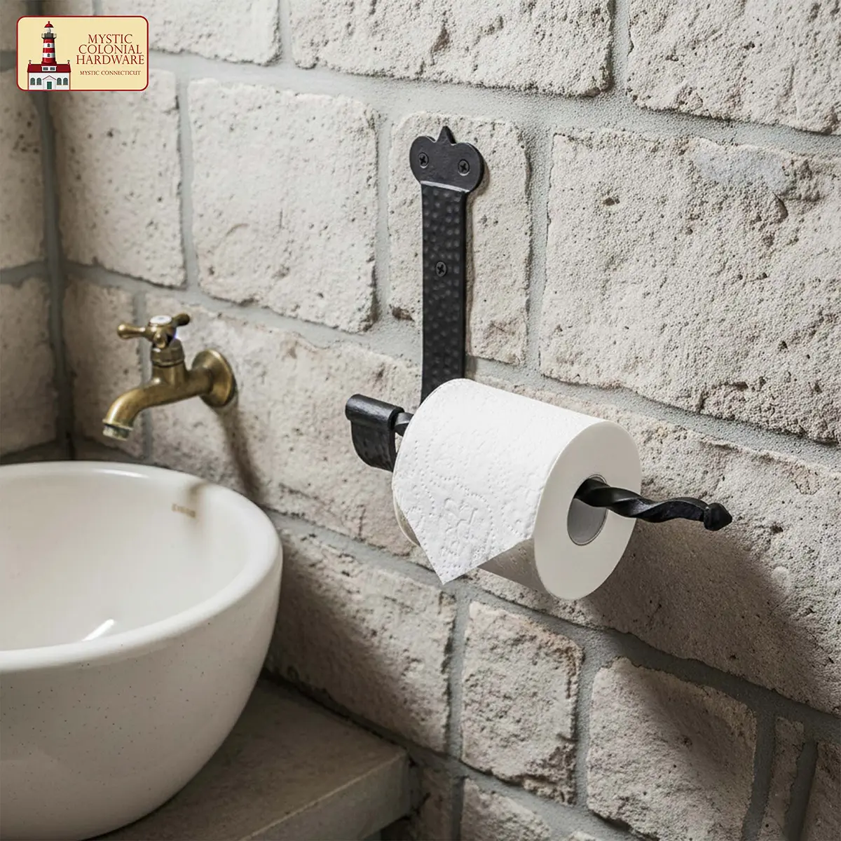 Hand-forged from solid iron, the holder has the classic hammered texture often seen in medieval-style hardware. The twisted horizontal rod adds visual character while providing strong support for toilet paper rolls or hand towels.