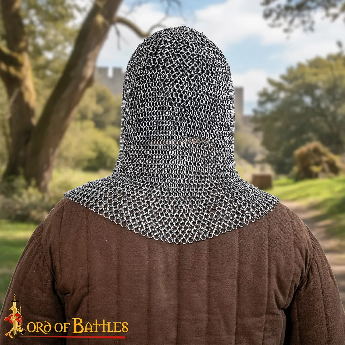 This Medieval Chainmail Coif with a V-shaped face opening brings together strength, comfort and true medieval style. Made from 16-gauge spring steel rings with a 9 mm inner diameter, it’s built to handle the rough and tumble of LARP battles, or costume wear while still staying light and flexible.