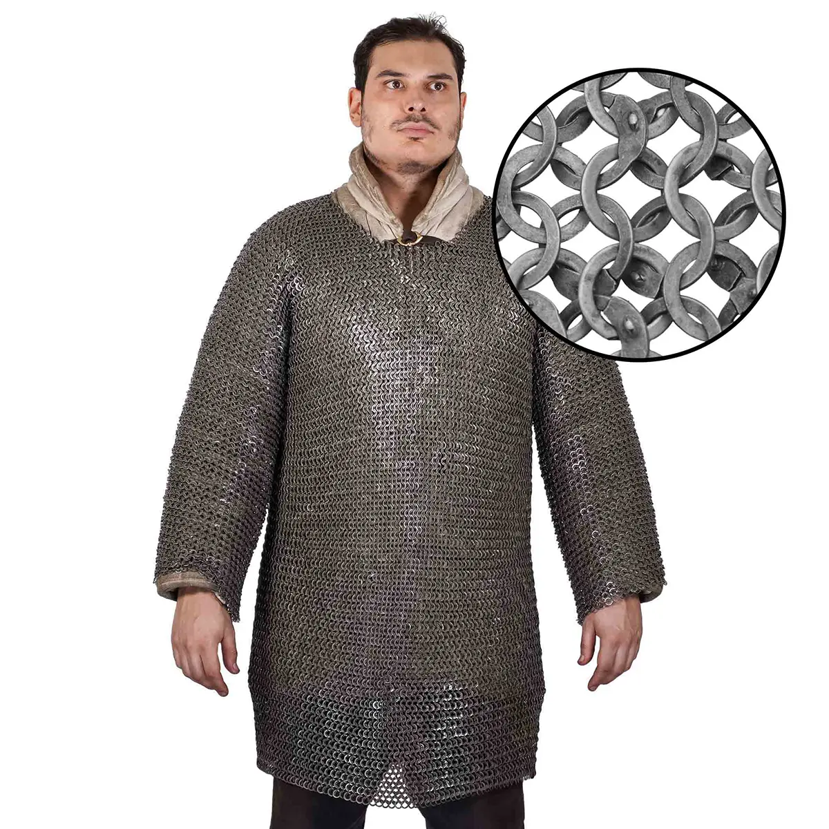 Step back into the medieval battlefield with our Medieval Chainmail Haubergeon, a shorter and more practical version of the traditional hauberk. Designed with half sleeves for easier movement and comfort, this armor is constructed from 9mm round riveted rings reinforced with alternating flat solid rings for superior strength and durability.