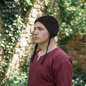 This Medieval Coif has two suede tie strings that can be secured under the chin, so that it stays properly in place while walking or working. The functional design shows the simplicity and practicality which was valued in historical clothing.