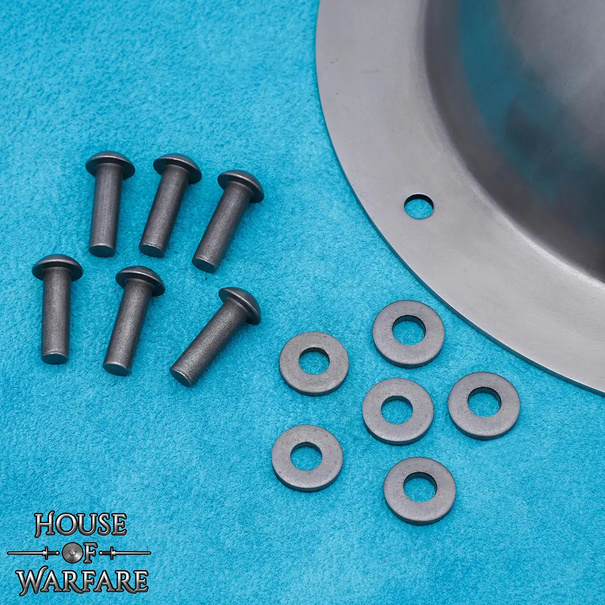 Pre-drilled mounting holes ensure easy installation, and matching rivets are included, allowing quick and secure attachment to wooden shields. Whether you are building a Viking round shield or restoring a medieval shield boss, this umbo gives both authenticity and reliability.