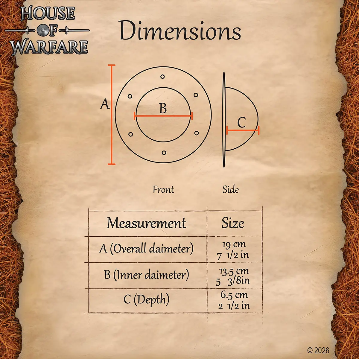 The umbo has a metallic polished finish on the outside for a clean, period-correct look, which can be easily spotted during use and the interior is coated to help reduce corrosion and rusting. This protective coating makes the Medieval Umbo more resistant to moisture, extending its lifespan even during outdoor events or humid conditions.