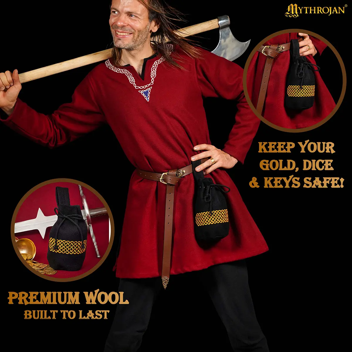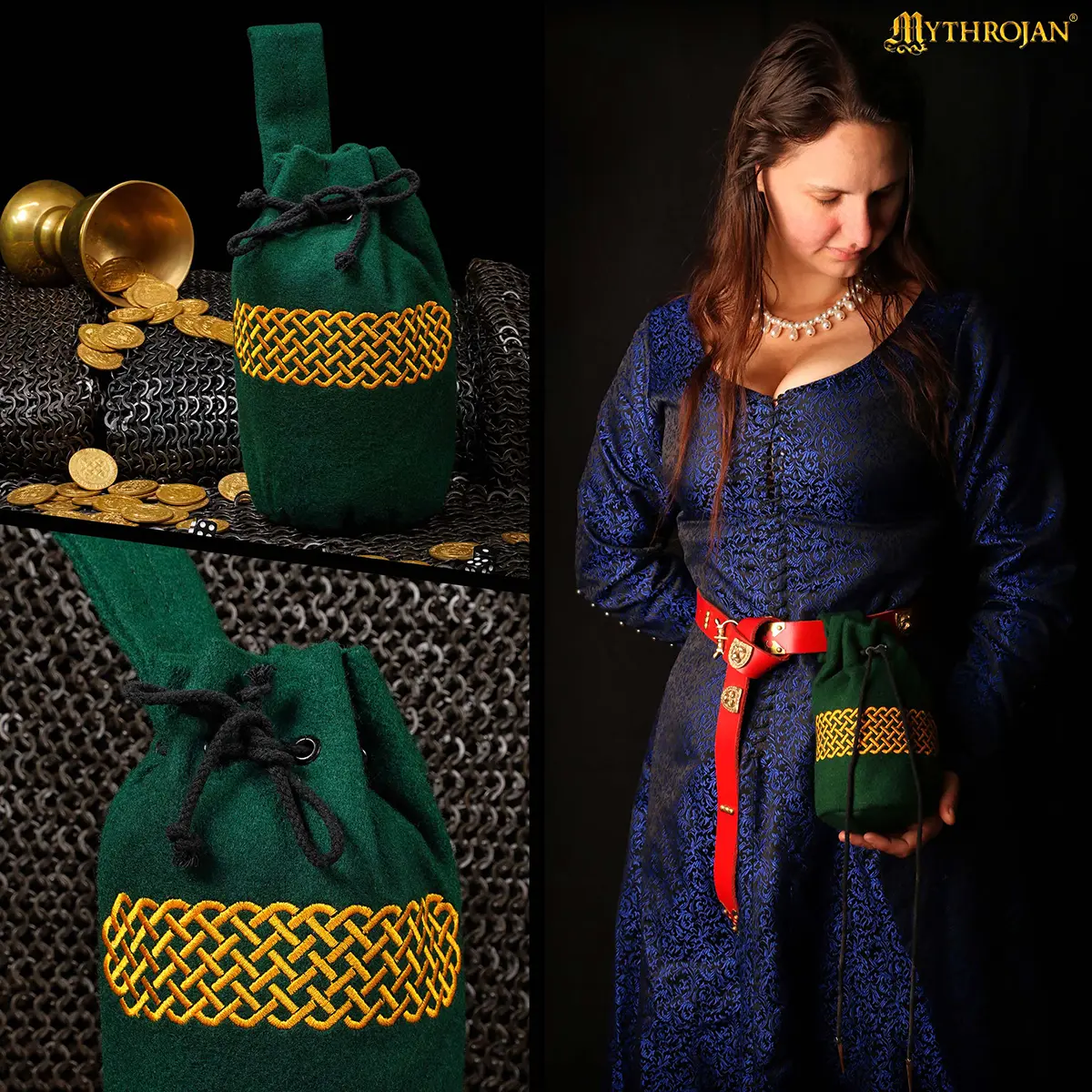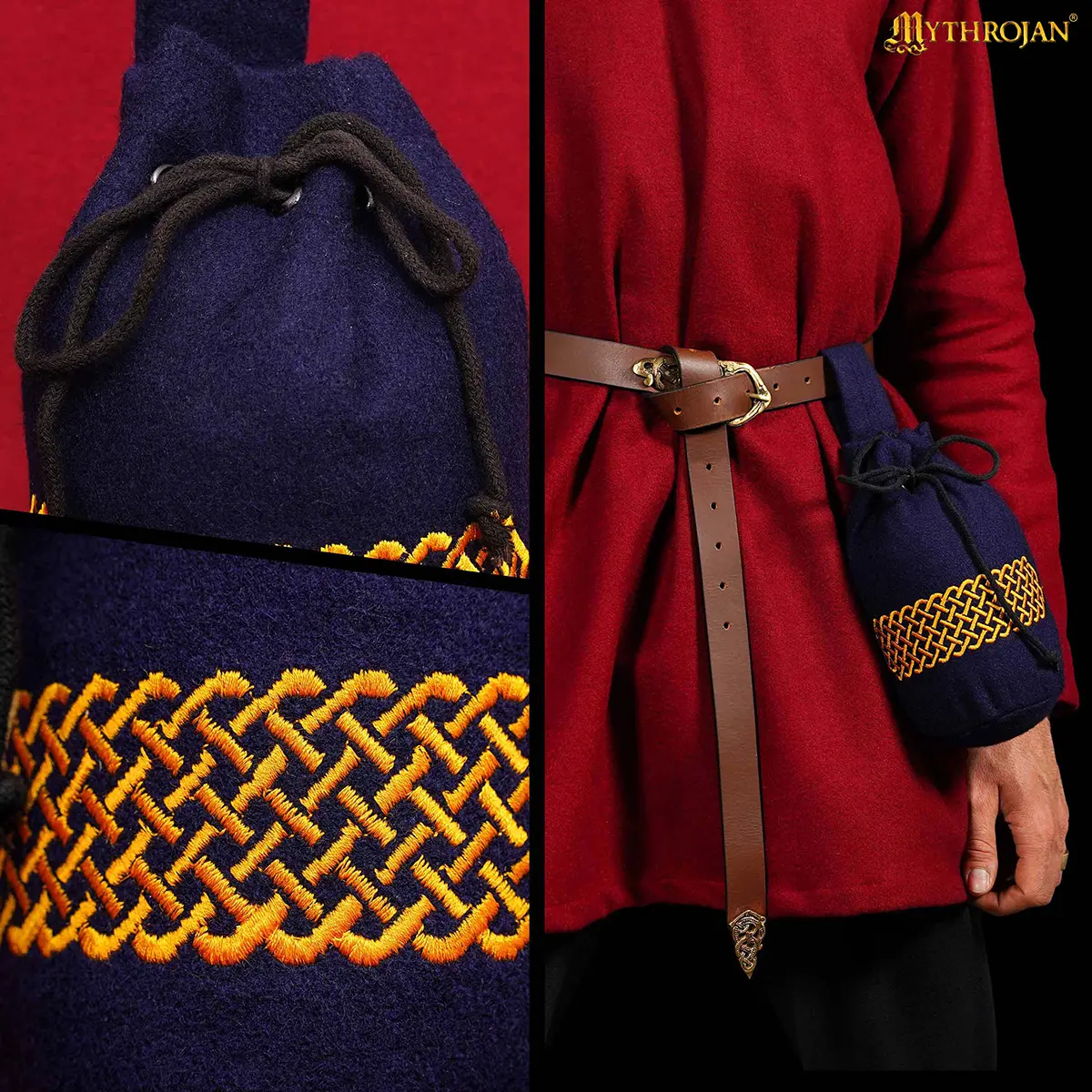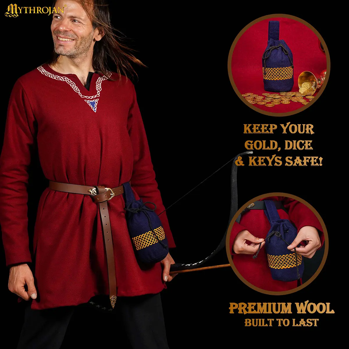This handcrafted medieval belt pouch is made from a 70% wool blend and adorned with elegant golden embroidery. More than just a bag, this pouch is designed to reflect the artistry and practicality of medieval craftsmanship, for both style and reliable functionality.