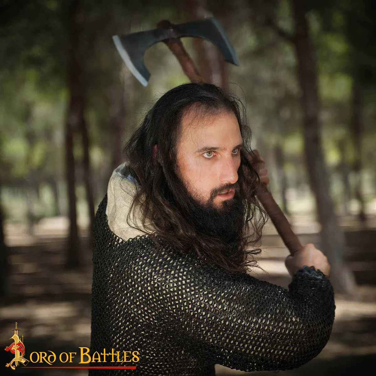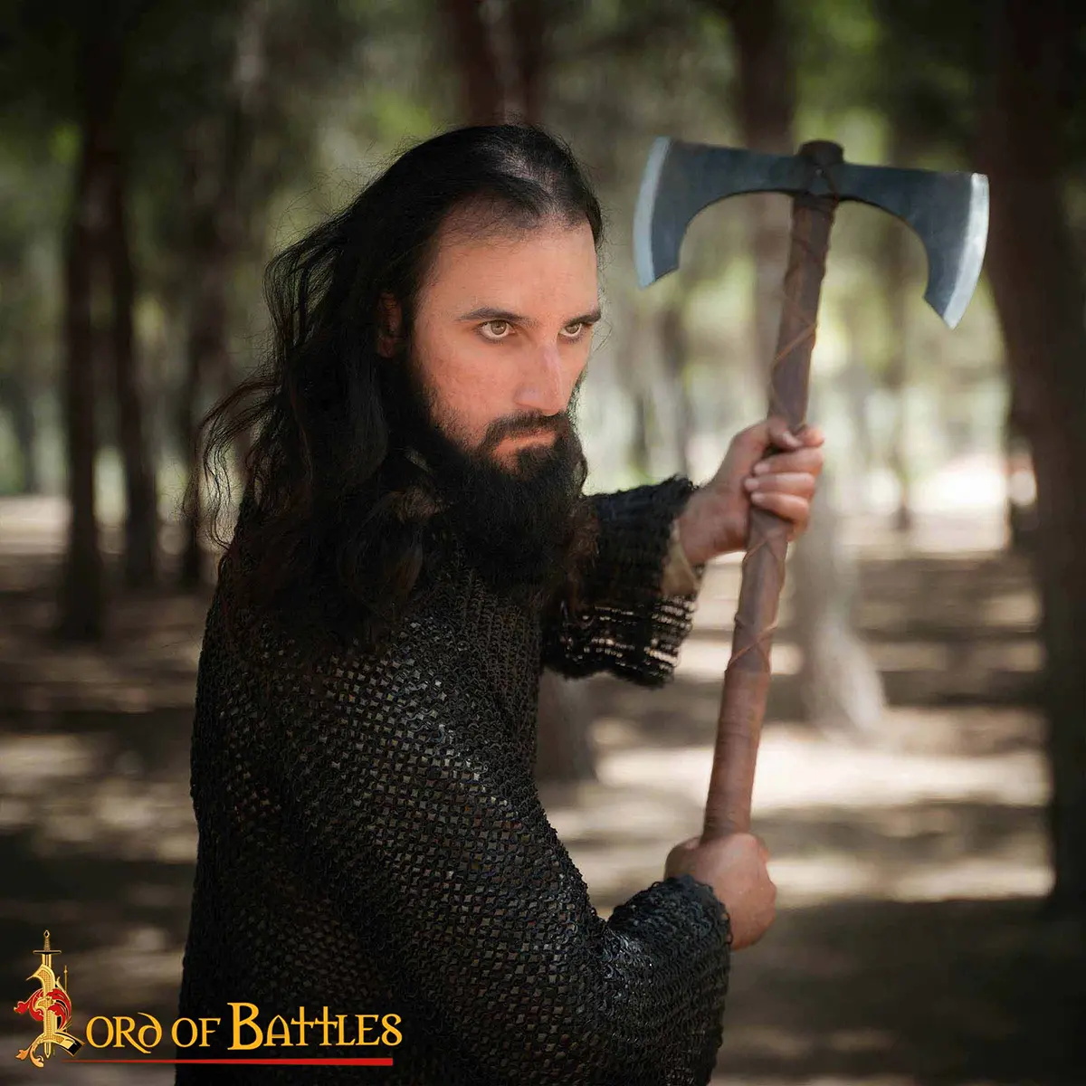 The head is HAND FORGED from sturdy CARBON STEEL and makes a FULLY FUNCTIONAL weapon, THAT NEEDS TO BE USED WITH EXTREME CAUTION. To keep it protected for years to come, we provide two LEATHER SHEATS that cover the blades when not in use. These sheaths close using GENUINE HORN TOGGLES that add to its rugged medieval look. The handle is crafted from ETHICALLY SOURCED TEAK WOOD, wrapped with a LEATHER STRING for enhanced grip. This axe comes dull for reenactor use and can be sharpened for real-life combat. Its total length is approx. 30 inches.