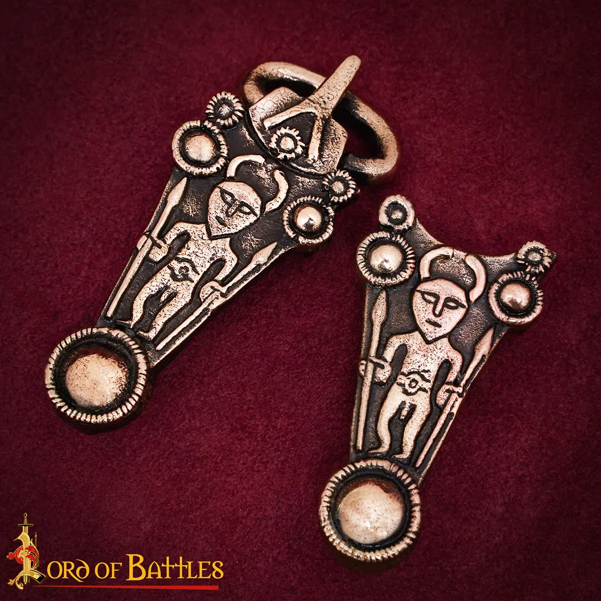 This Early Medieval Belt Buckle Set is a faithful historical reproduction of ornate belt hardware worn between the 8th and 10th centuries. The set includes a buckle and a belt end mount, both richly detailed with stylized human figures and ringed disc motifs, believed to symbolize celestial or ritual significance.