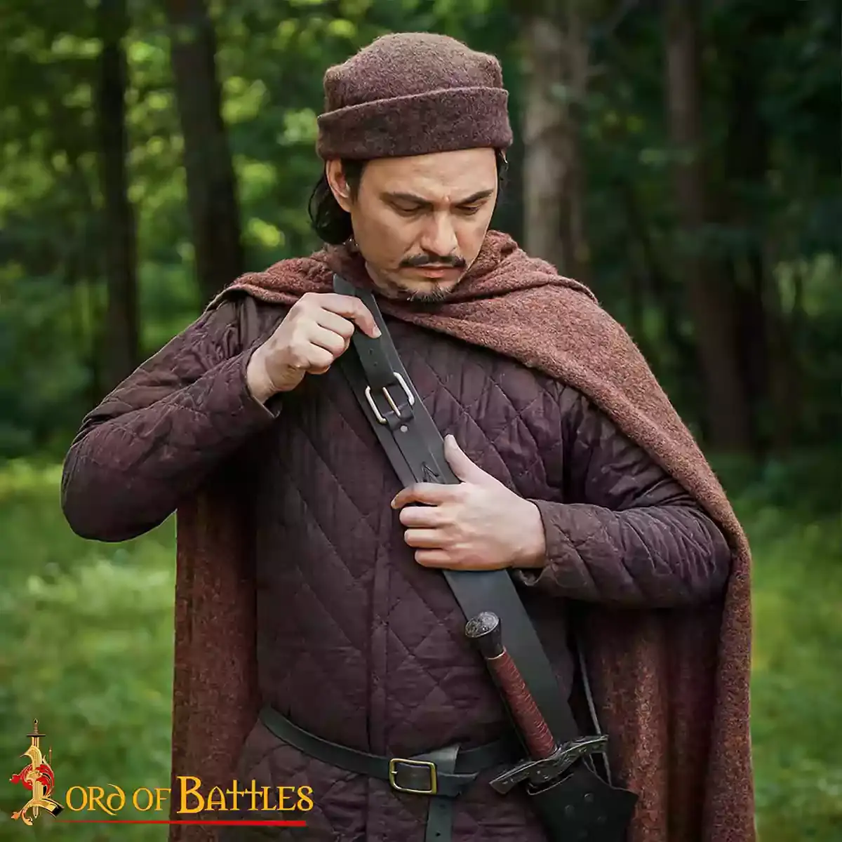 The solid brass buckle and rivets add strength and period authenticity, complementing the rugged look. Thanks to its adjustable design, this leather sword baldric comfortably fits a wide range of arming swords to rapiers for LARP, Renaissance fairs, or theatrical settings. Whether used as a baldric sword holder for combat or display, its versatility makes it a favourite among knights, adventurers and collectors.