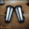Inspired by historical 14th to 15th-century splinted armor, this pair of medieval leather bracers delivers battle-ready protection without sacrificing flexibility. Splinted armor was commonly used in medieval Europe, combining leather or fabric with vertical steel strips to protect limbs while keeping movement unrestricted. These bracers reflect that tradition with a durable full-leather base and 16 gauge steel plates firmly riveted in place.