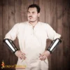 These bracers are made from genuine leather and hardened steel. Leather may exhibit natural variations in texture and tone, which add to the authenticity of each piece. The steel plates are riveted by hand to ensure durability and visual impact. Crafted using traditional methods, this set is built for both function and flair.