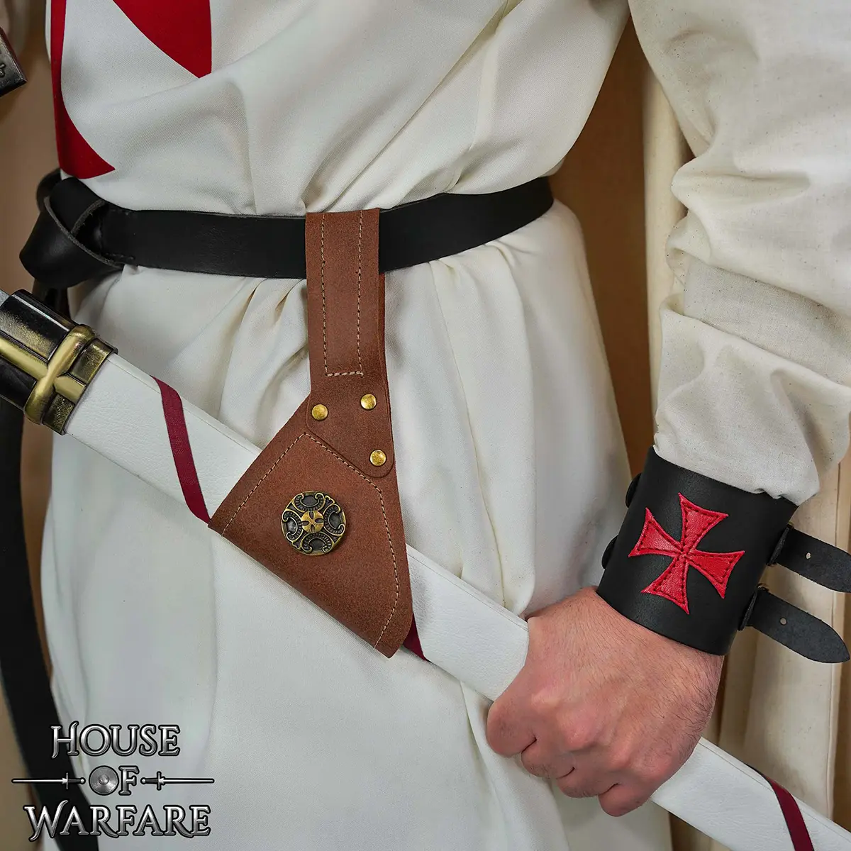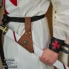 The body of the frog is reinforced with brass rivets and features a decorative antique bronze button with a raised heraldic cross motif framed by a floral border. This design, evoking religious orders and knightly oaths, makes the frog especially suited for Crusader, Templar, or noble knight character builds.