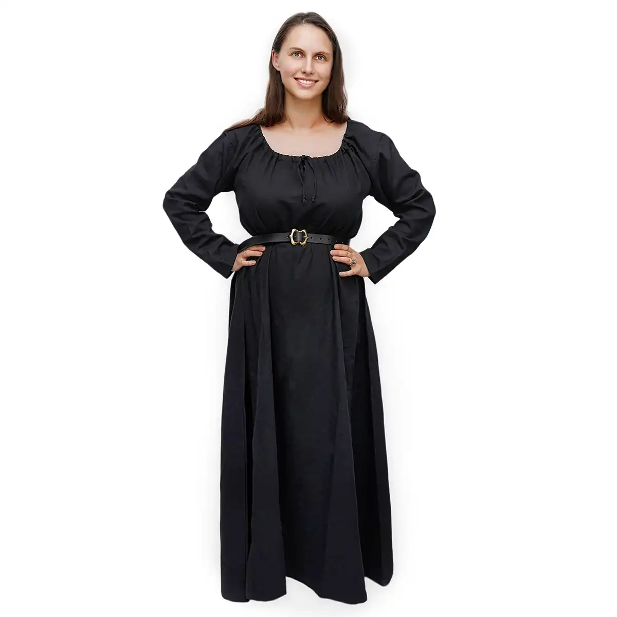 The dress has a straight, flowing cut with full sleeves, a drawstring neckline, and side gores for natural movement. The drawstring neckline gives easy adjustment to suit your fit and style, the gores triangular panels of fabric, create a graceful flare without adding bulk. This design gives freedom of movement, whether you’re walking or participating in medieval field activities.