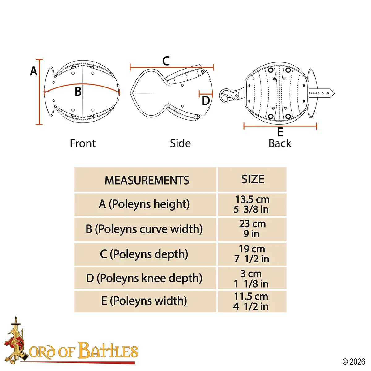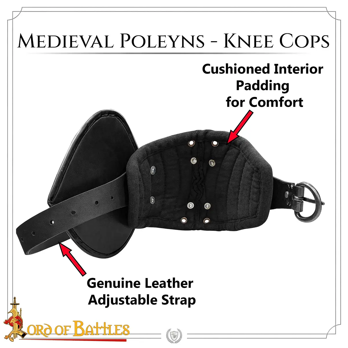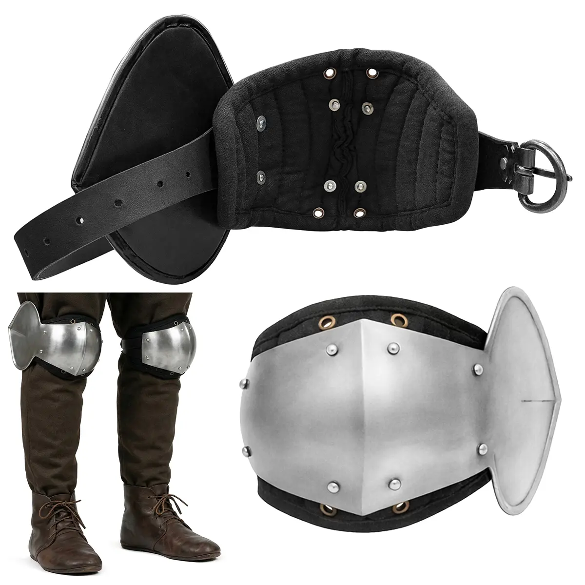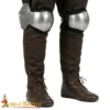 For comfort during prolonged wear, each poleyn is fitted with a padded cotton liner that cushions impact and prevents chafing. Adjustable genuine leather straps with steel buckles make it easy to achieve a snug, secure fit, whether worn over mail or padded trousers.