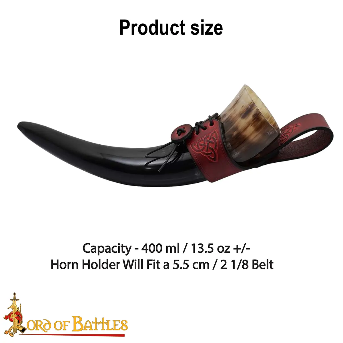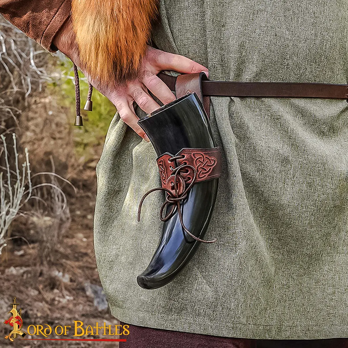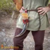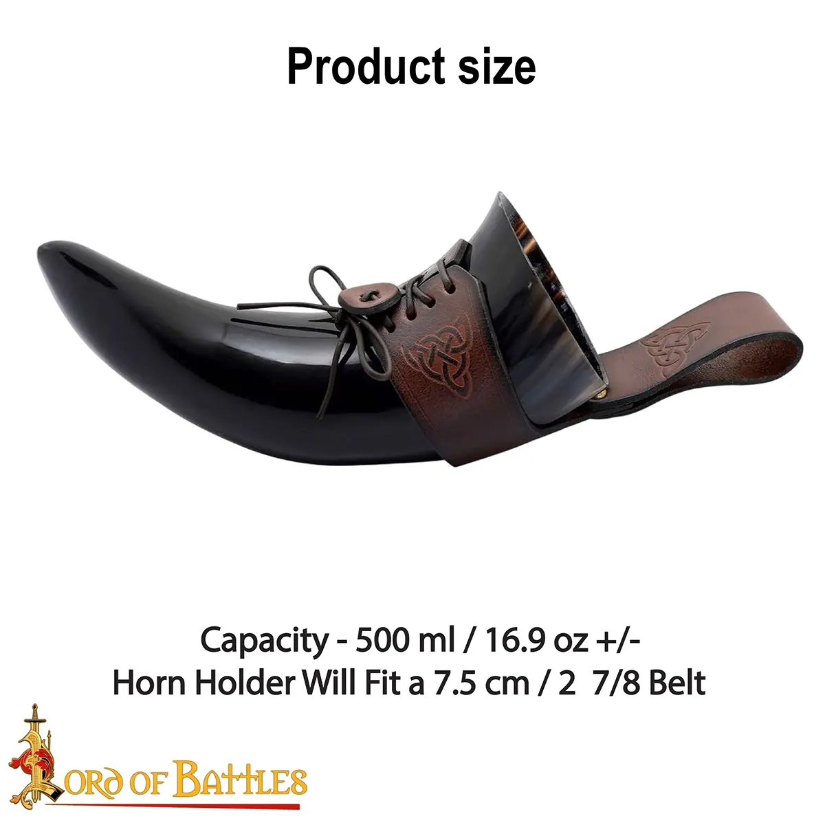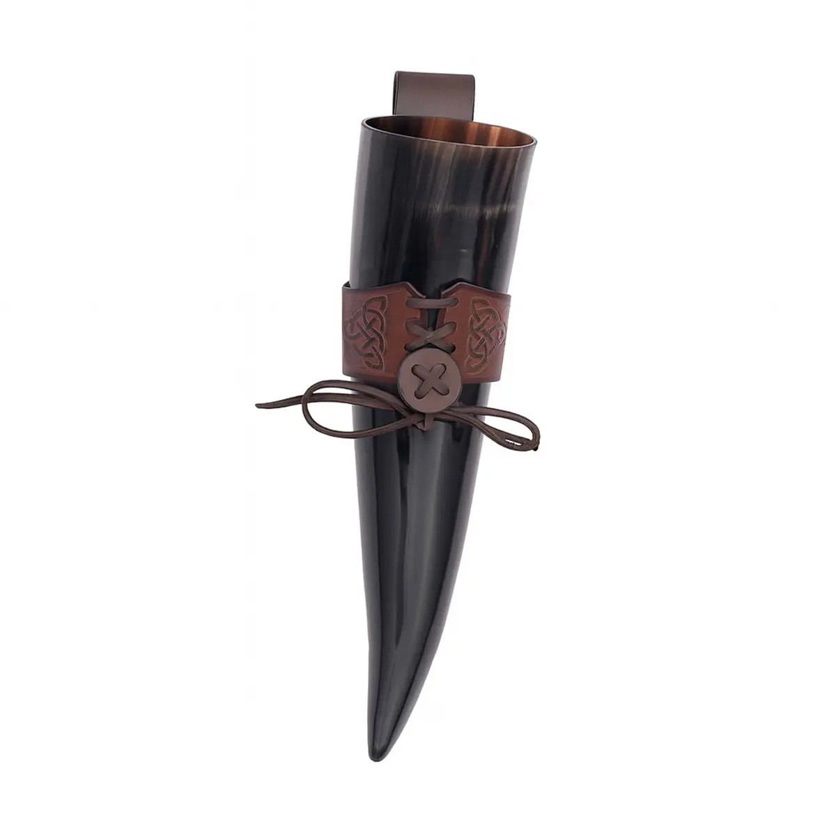 The Celtic knotwork engraved on the holder symbolizes eternity and unity, adding a touch of artistry and history. The laced fastening allows it to adjust to your horn securely, while the belt loop lets you carry it hands-free, ideal for feasts, LARP events, or Renaissance fairs.