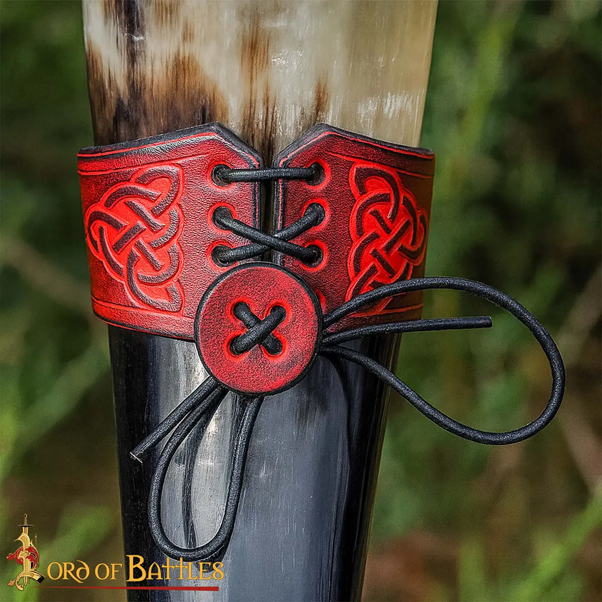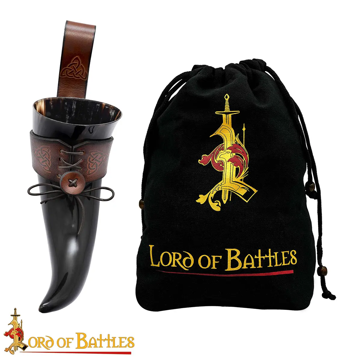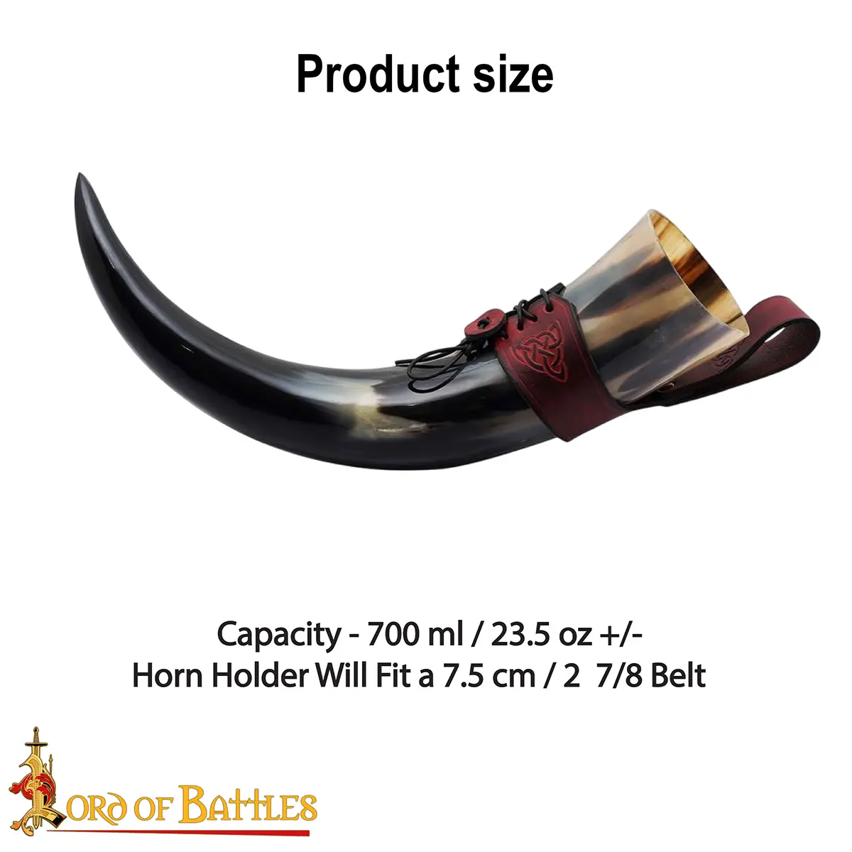 The Celtic knotwork engraved on the holder symbolizes eternity and unity, adding a touch of artistry and history. The laced fastening allows it to adjust to your horn securely, while the belt loop lets you carry it hands-free, ideal for feasts, LARP events, or Renaissance fairs.