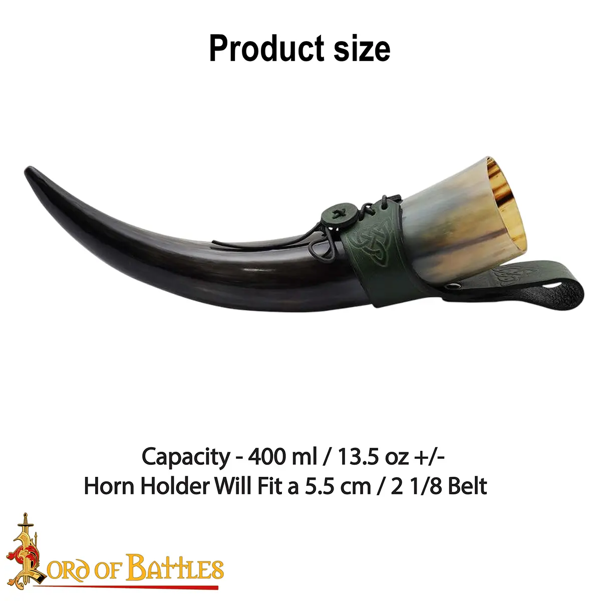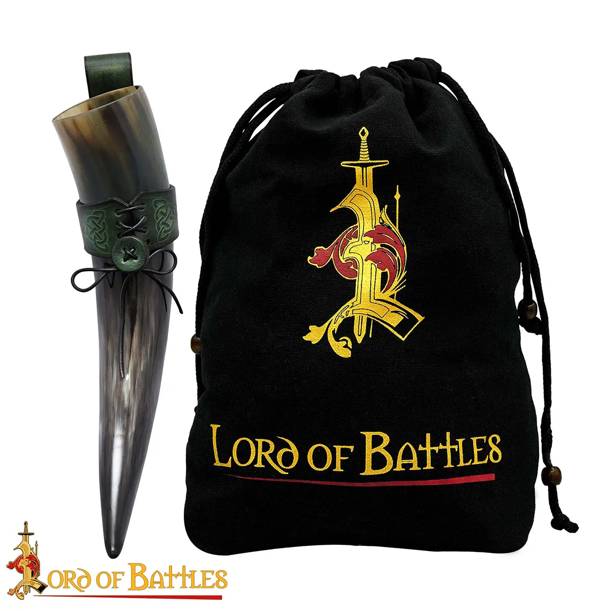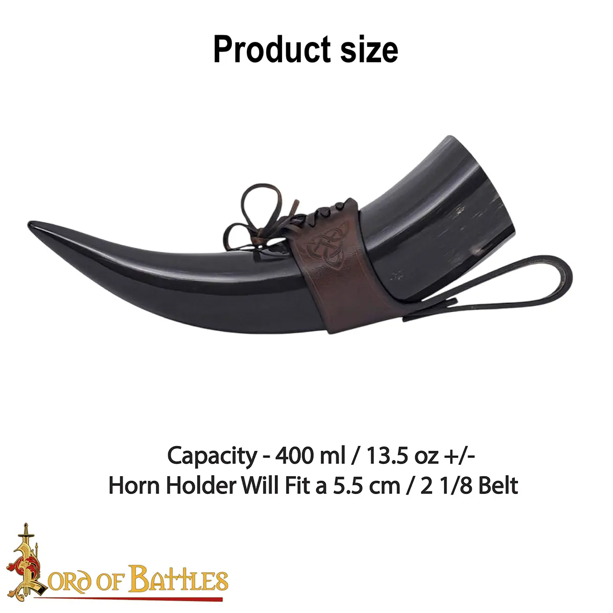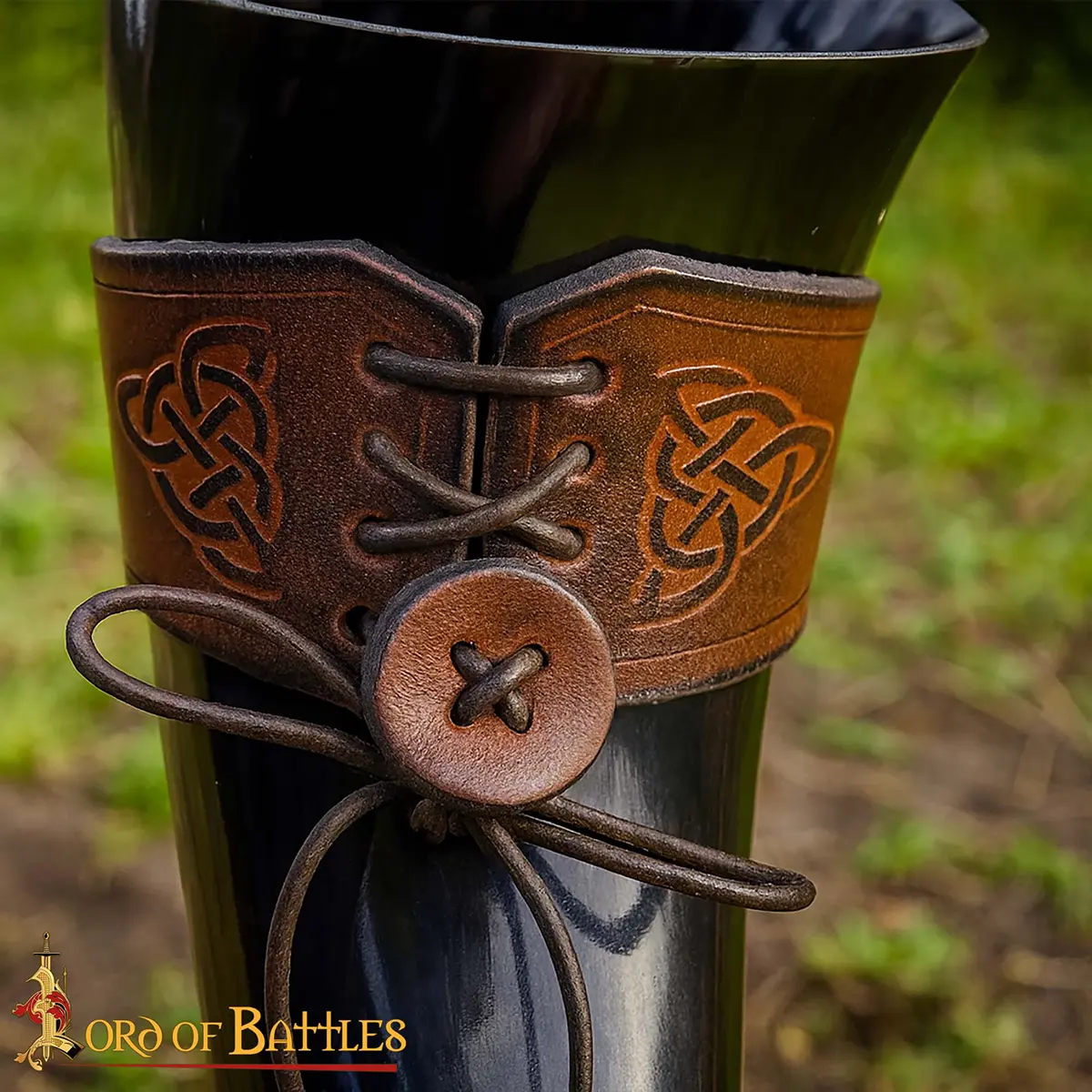 The Celtic knotwork engraved on the holder symbolizes eternity and unity, adding a touch of artistry and history. The laced fastening allows it to adjust to your horn securely, while the belt loop lets you carry it hands-free, ideal for feasts, LARP events, or Renaissance fairs.