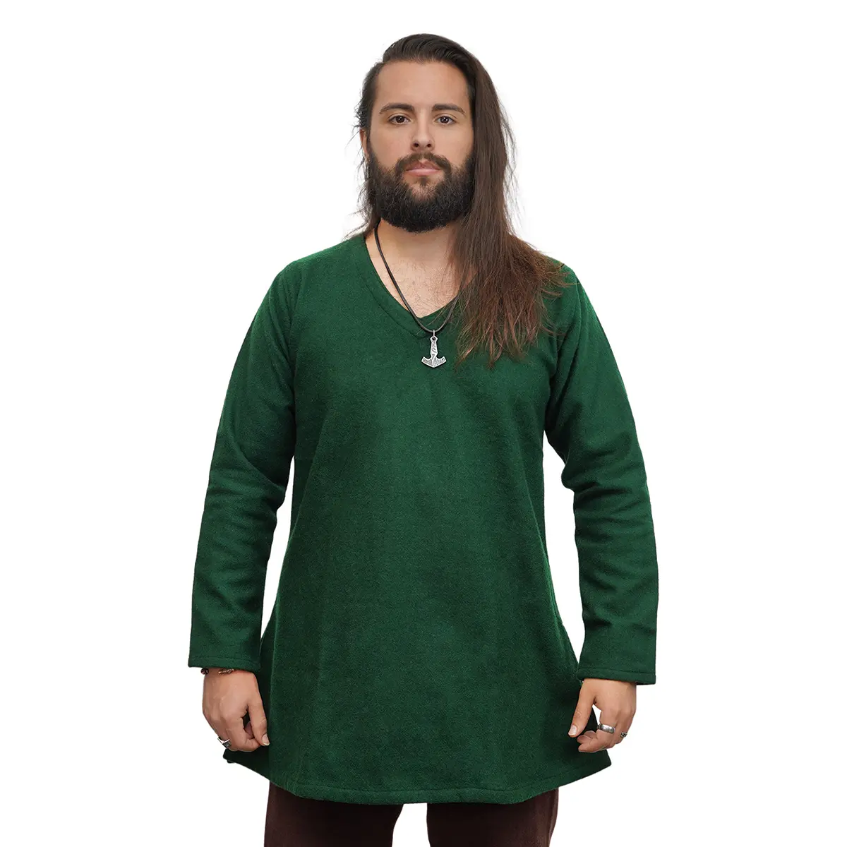 This Medieval Wool Tunic in Green, inspired by Viking and early medieval attire is expertly made from a 70% wool and 30% blended fiber fabric, this tunic strikes the perfect balance between authenticity, comfort, and practicality. The wool offers natural insulation keeping you warm on cool days and evenings, while the blend ensures flexibility, durability, and ease of wear during long reenactments or festivals.