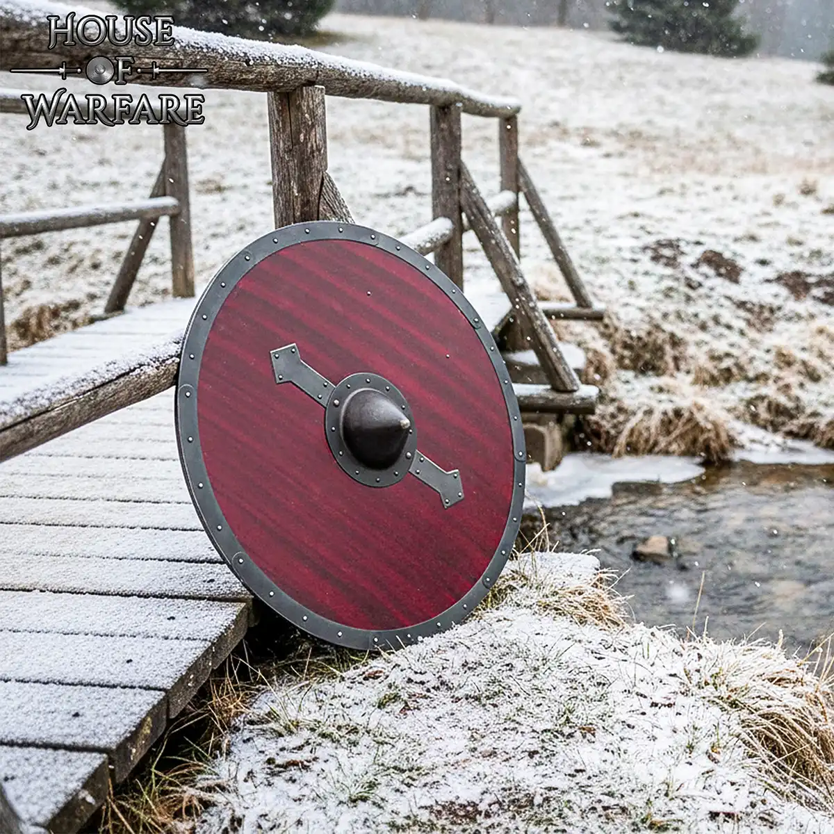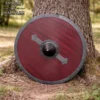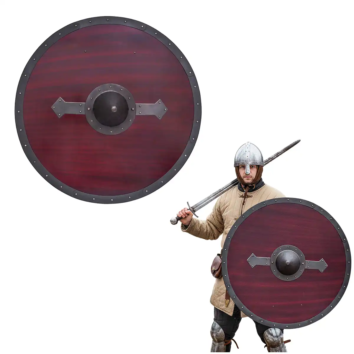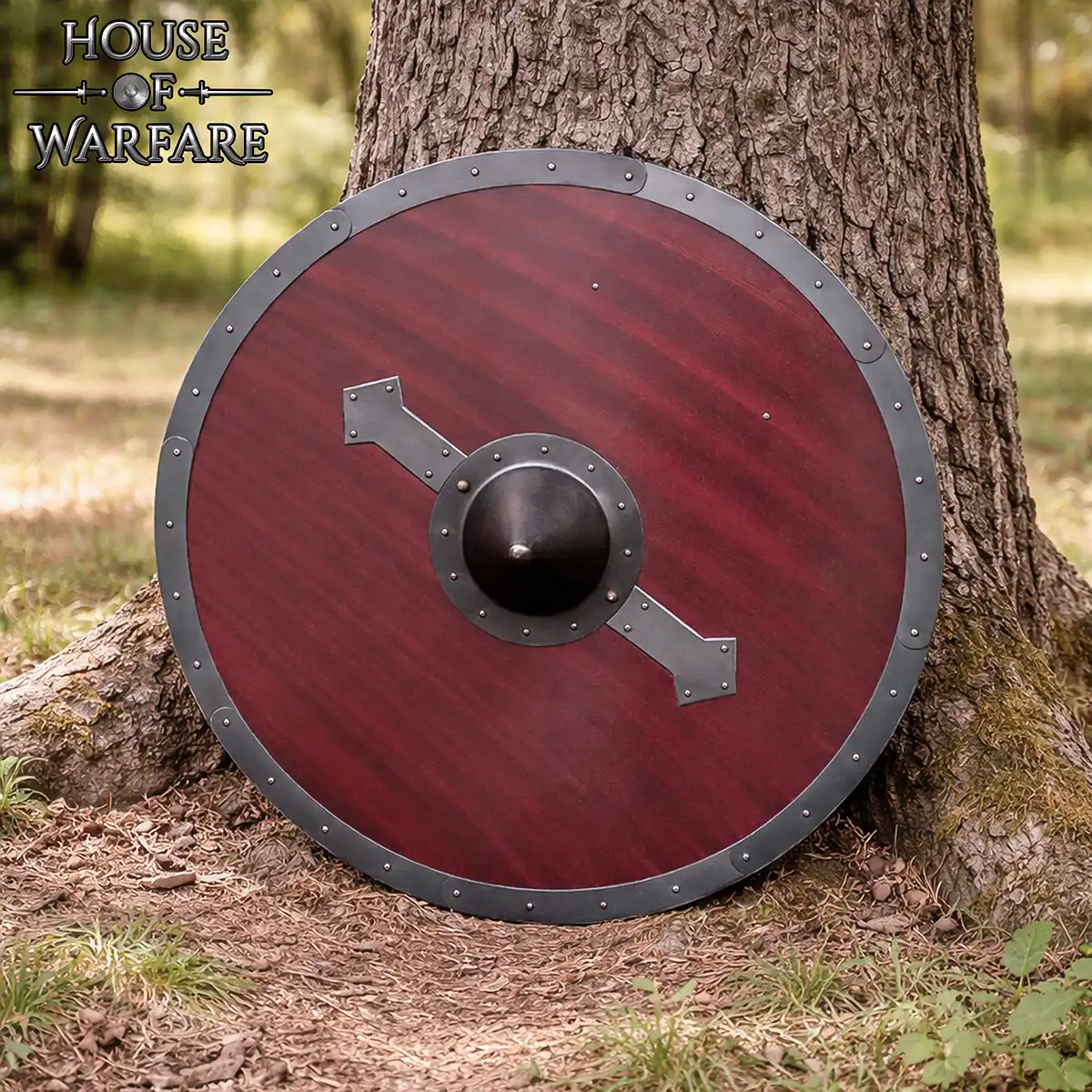 This medieval wooden shield is inspired by the round shields which were used across Europe during the early and high Middle Ages. Shields of this type were important defensive tools on the battlefield, for protection while giving freedom of movement and strong offensive tactics with the central boss.