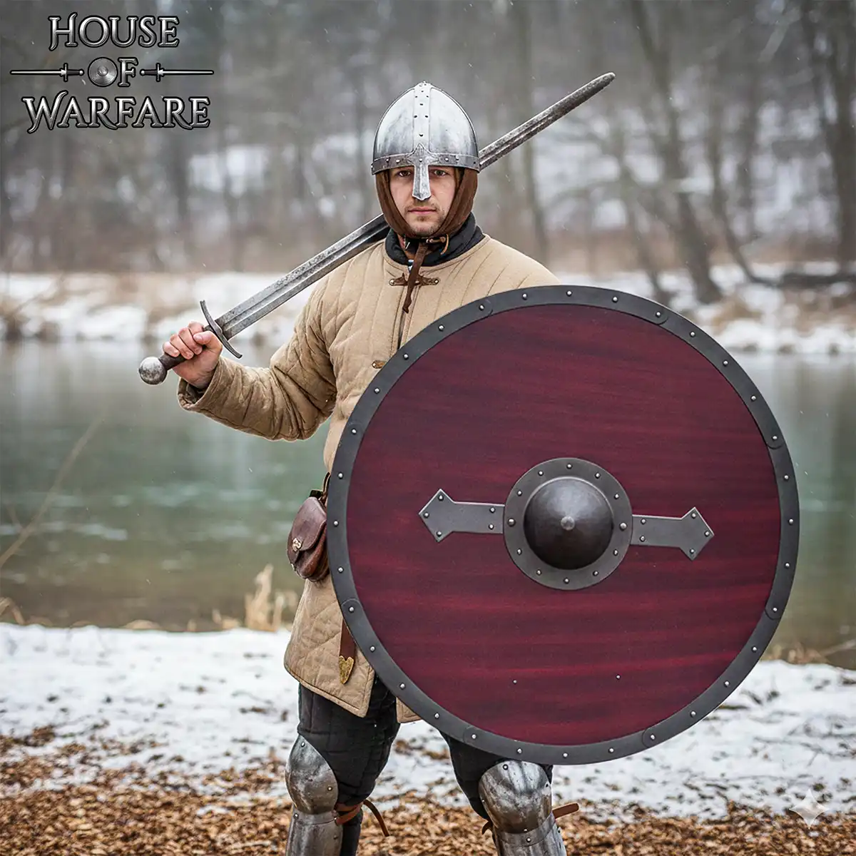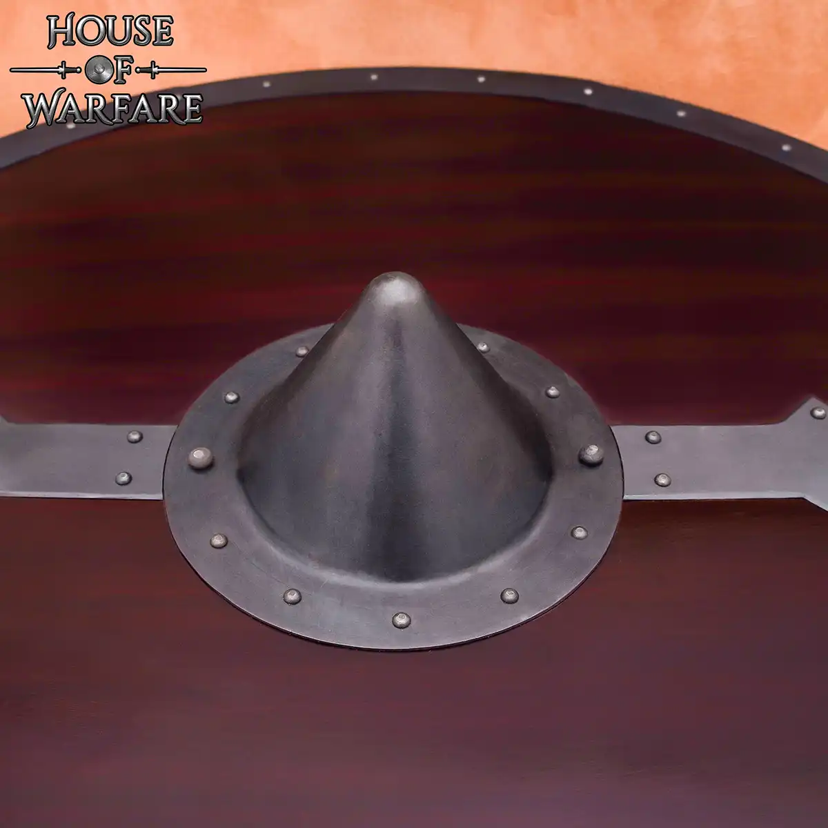 Around the edge, the shield has 18 gauge steel binding, which reinforces the rim and protects the wood from splitting during strikes. At the centre is a 16 gauge steel conical umbo (shield boss). The umbo was designed to protect the hand and was also used to punch, deflect blows.