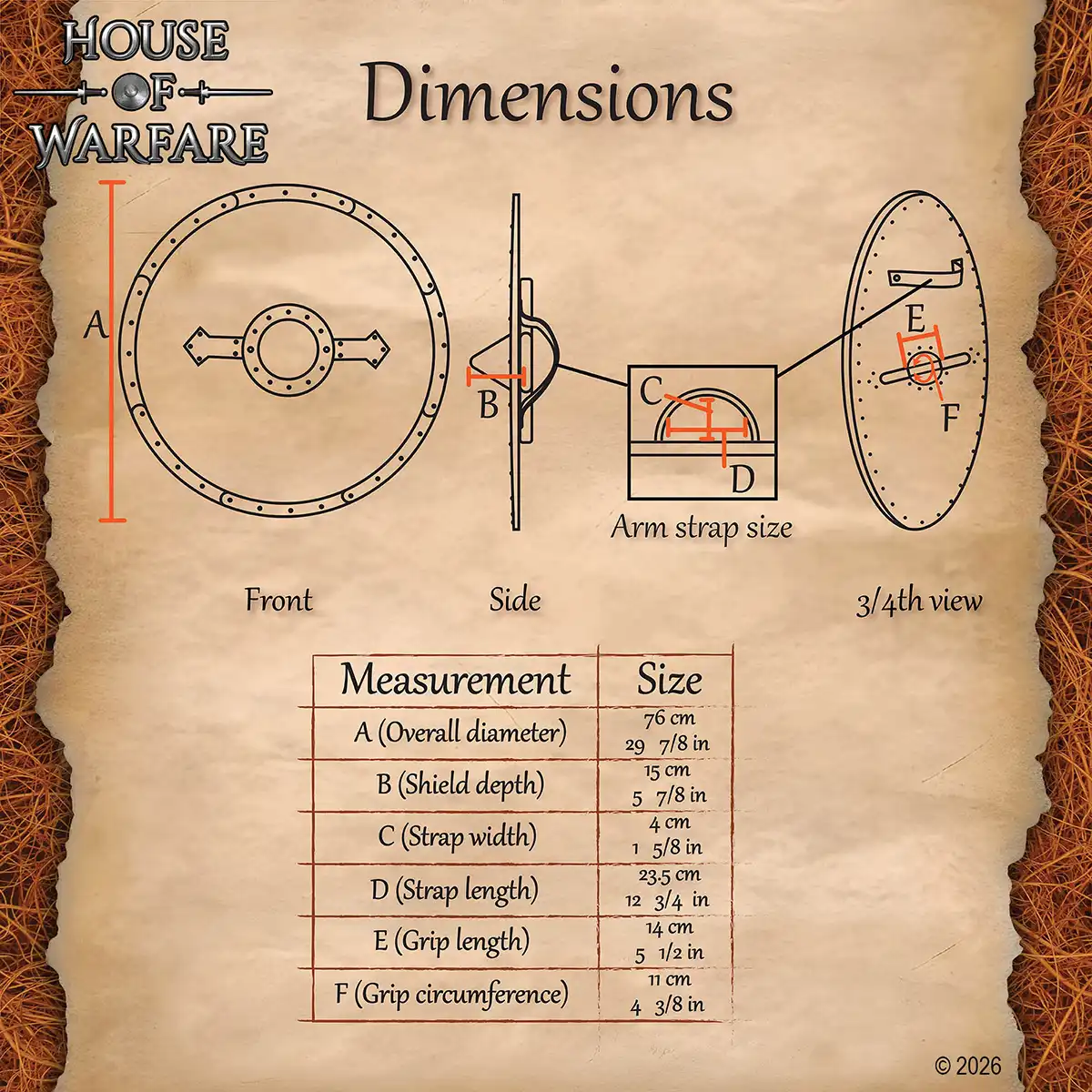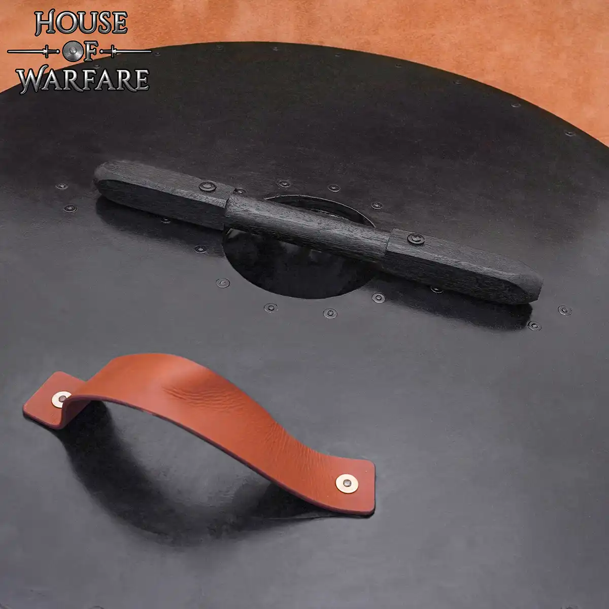 With a diameter of 76 cm (29 7/8 inches), this large round shield gives excellent coverage without being overly heavy. The back of the shield is painted black for durability and look, and it has a sturdy wooden handle along with a genuine leather strap for comfortable use.