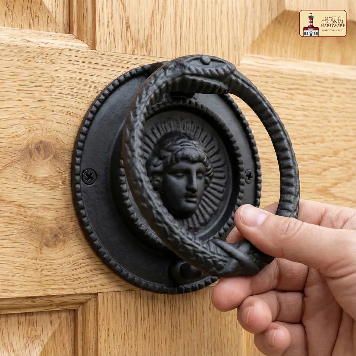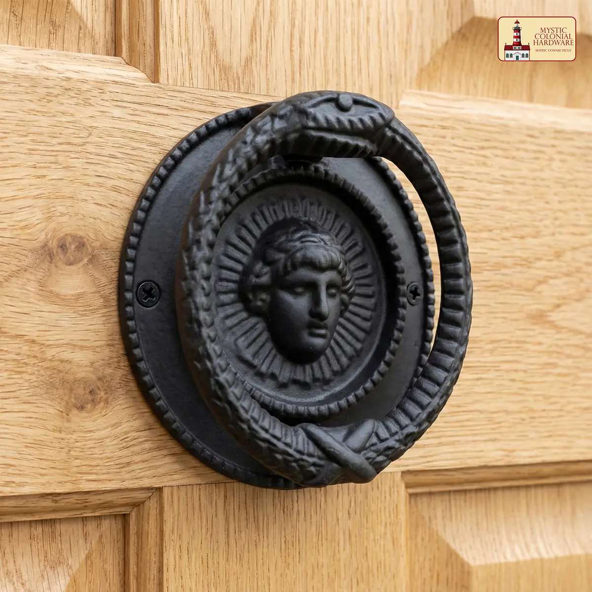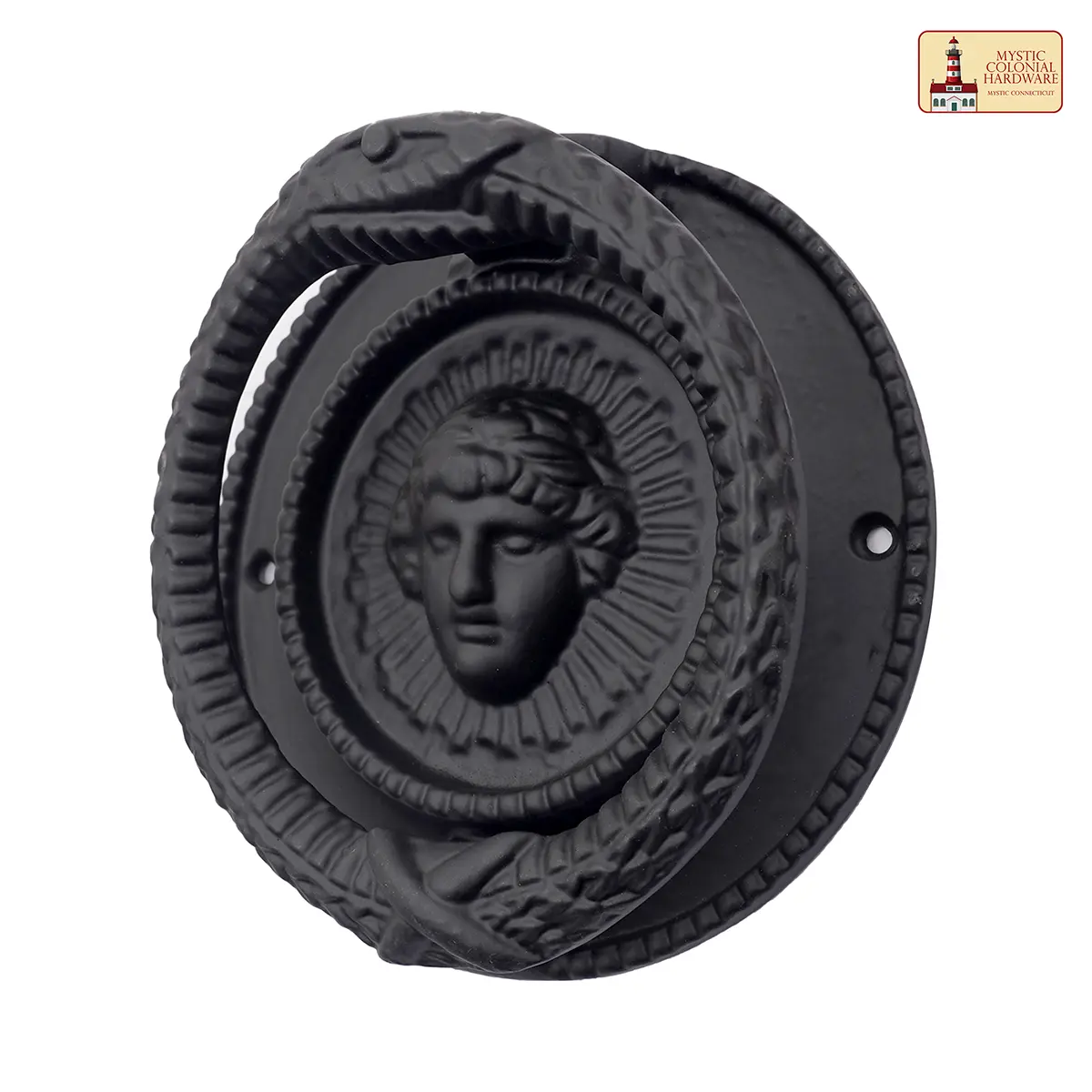 With its mythological roots and dark, gothic finish, this knocker is a stunning accent for a wide range of aesthetics: