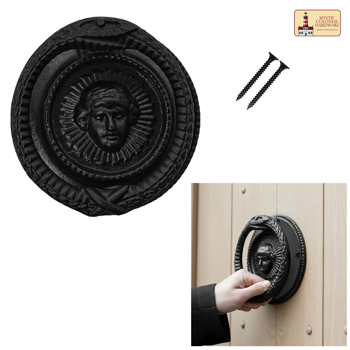 With two side-mounted holes and included screws, this knocker is easy to install and ready to use. Durable, weather-resistant, and full of old-world charm, it serves as both a practical piece and a conversation-starting centerpiece.