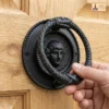 Mythological Design: Features a Medusa-style face and a snake ring knocker in a symbolic ouroboros design.