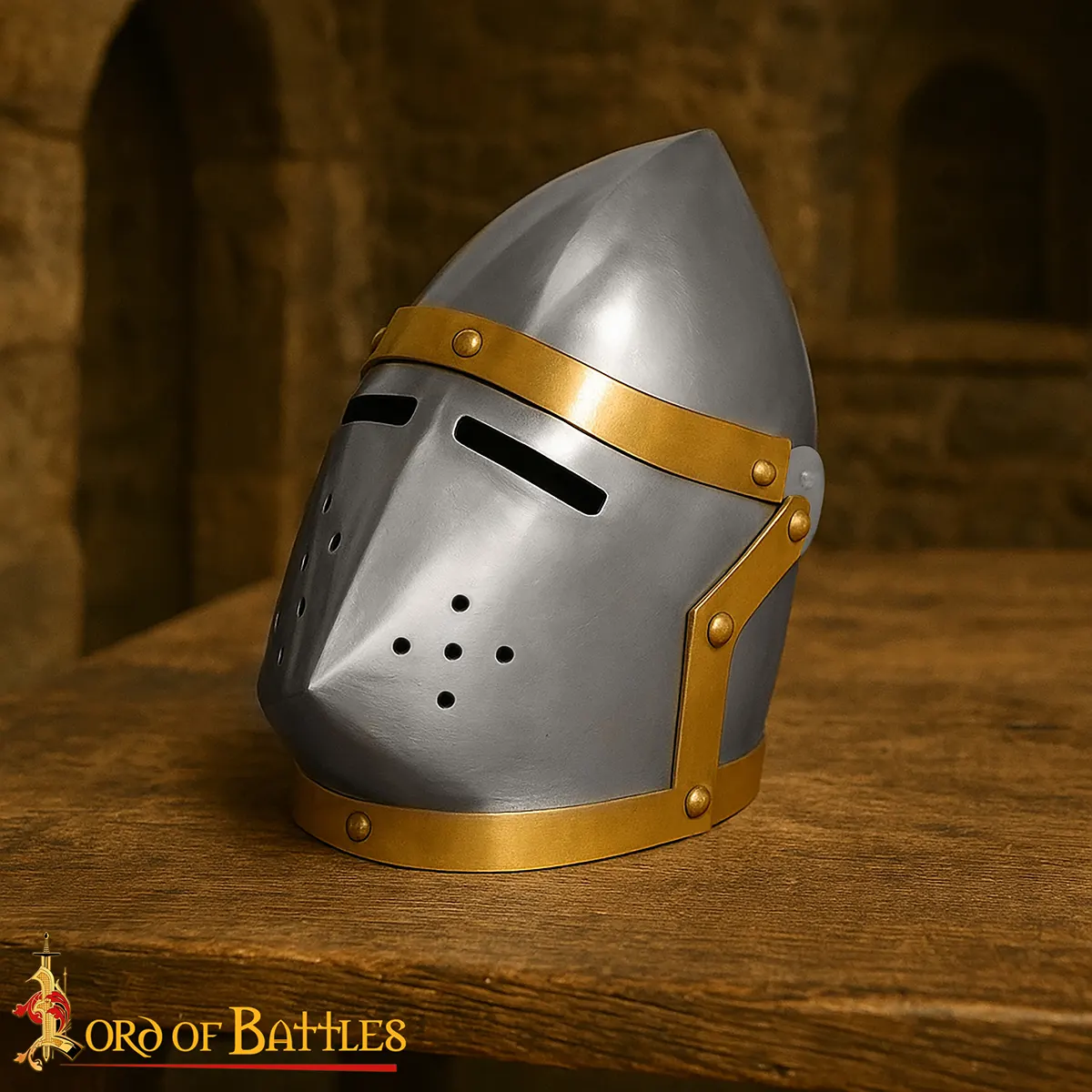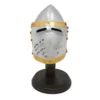 A finely handcrafted miniature Pig Face Bascinet, made from 20-gauge mild steel with pure brass details and a chrome finish. A perfect gift for history enthusiasts and art lovers, this stunning replica adds a touch of medieval charm to any collection.