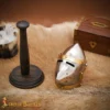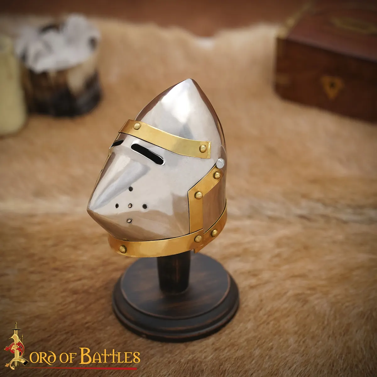 This miniature bascinet captures the essence of 14th-century European armor, known for its distinctive visor and excellent battle protection. A symbol of chivalry and craftsmanship, it’s an elegant addition to any historical décor.