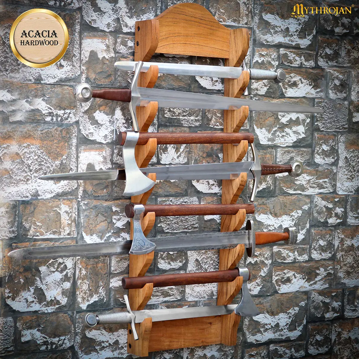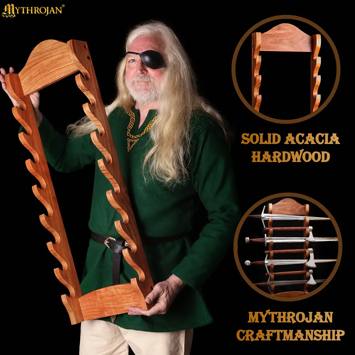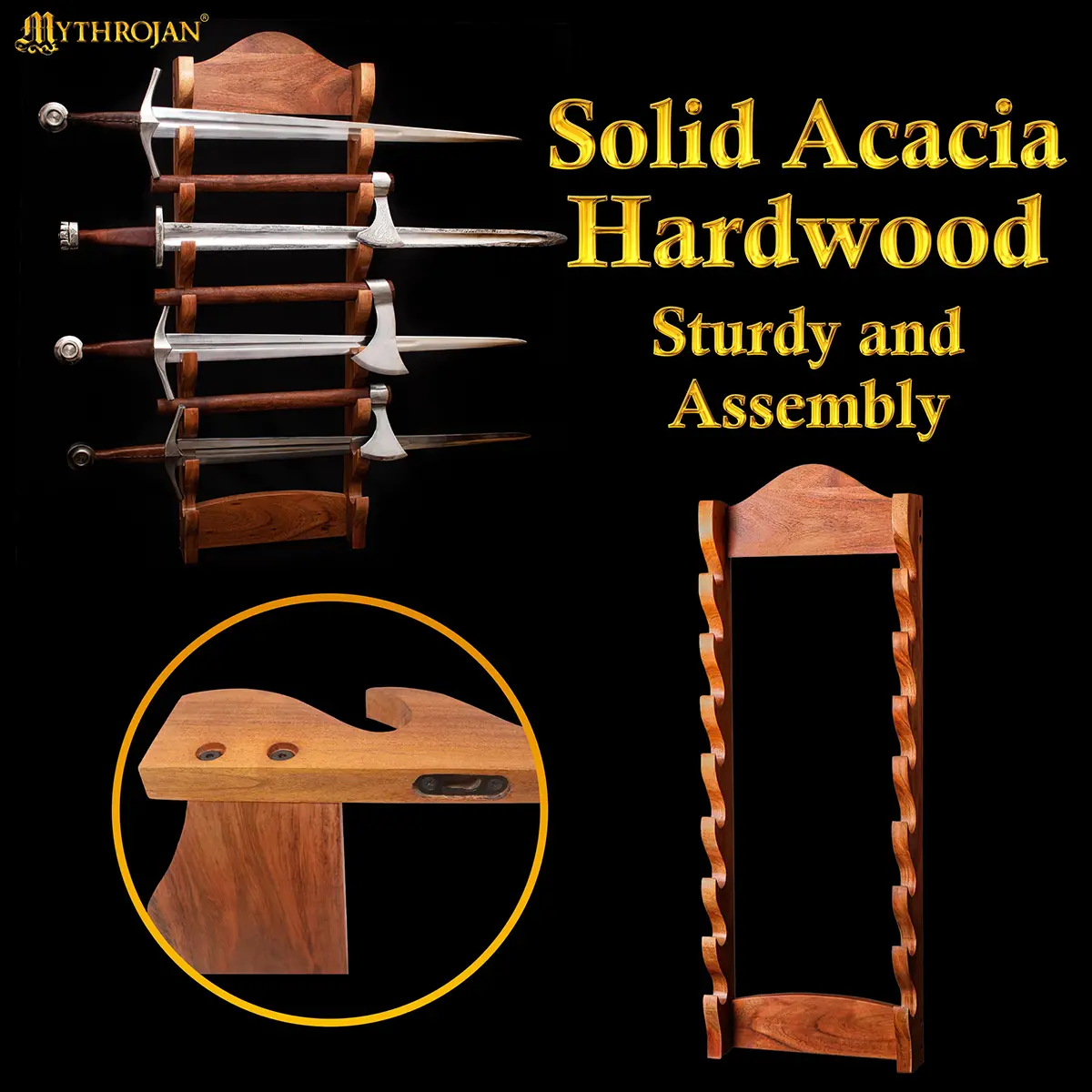 Display your prized weapons in true style with this Premium Tier Solid Acacia Hardwood Sword Rack. This wall-mounted display Sword Stand can hold up to siz or eight swords, axes, or similar collectibles, making it a centrepiece for your armoury, study or home space, depending on your choice.