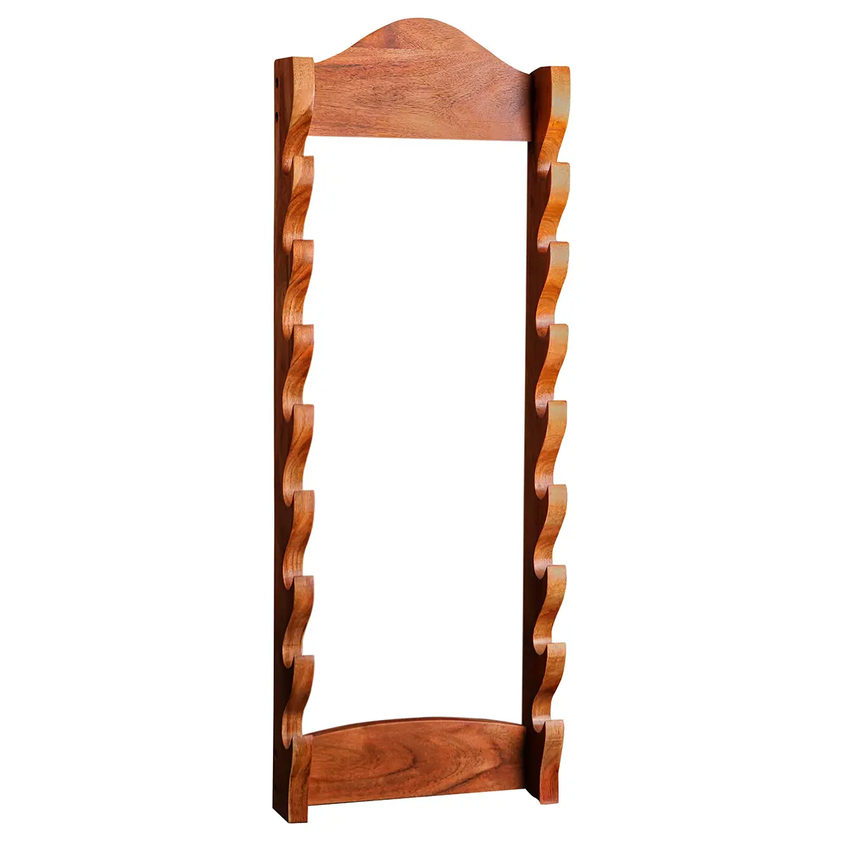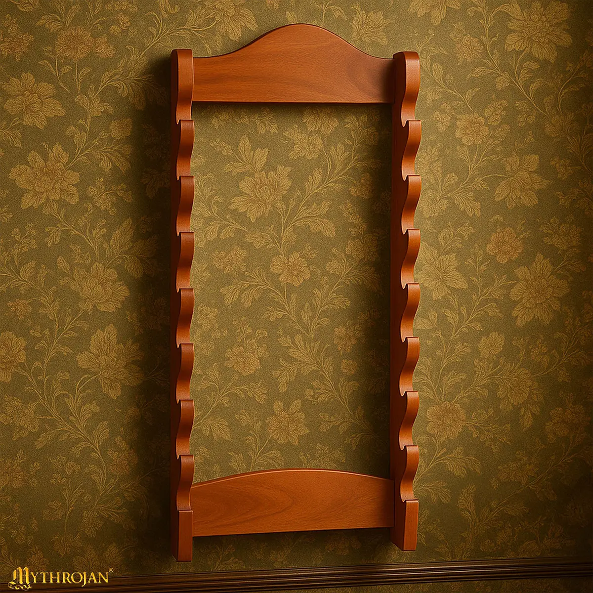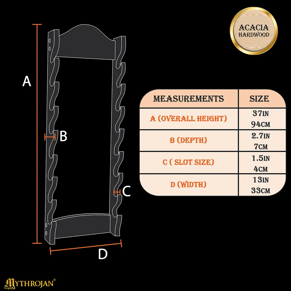 Display your prized weapons in true style with this Premium Tier Solid Acacia Hardwood Sword Rack. This wall-mounted display Sword Stand can hold up to siz or eight swords, axes, or similar collectibles, making it a centrepiece for your armoury, study or home space, depending on your choice.