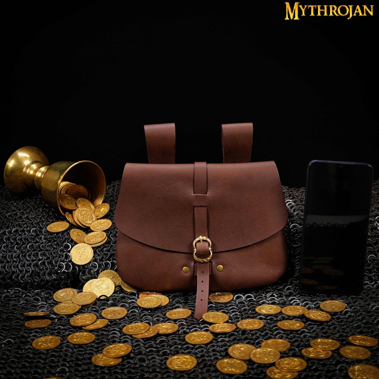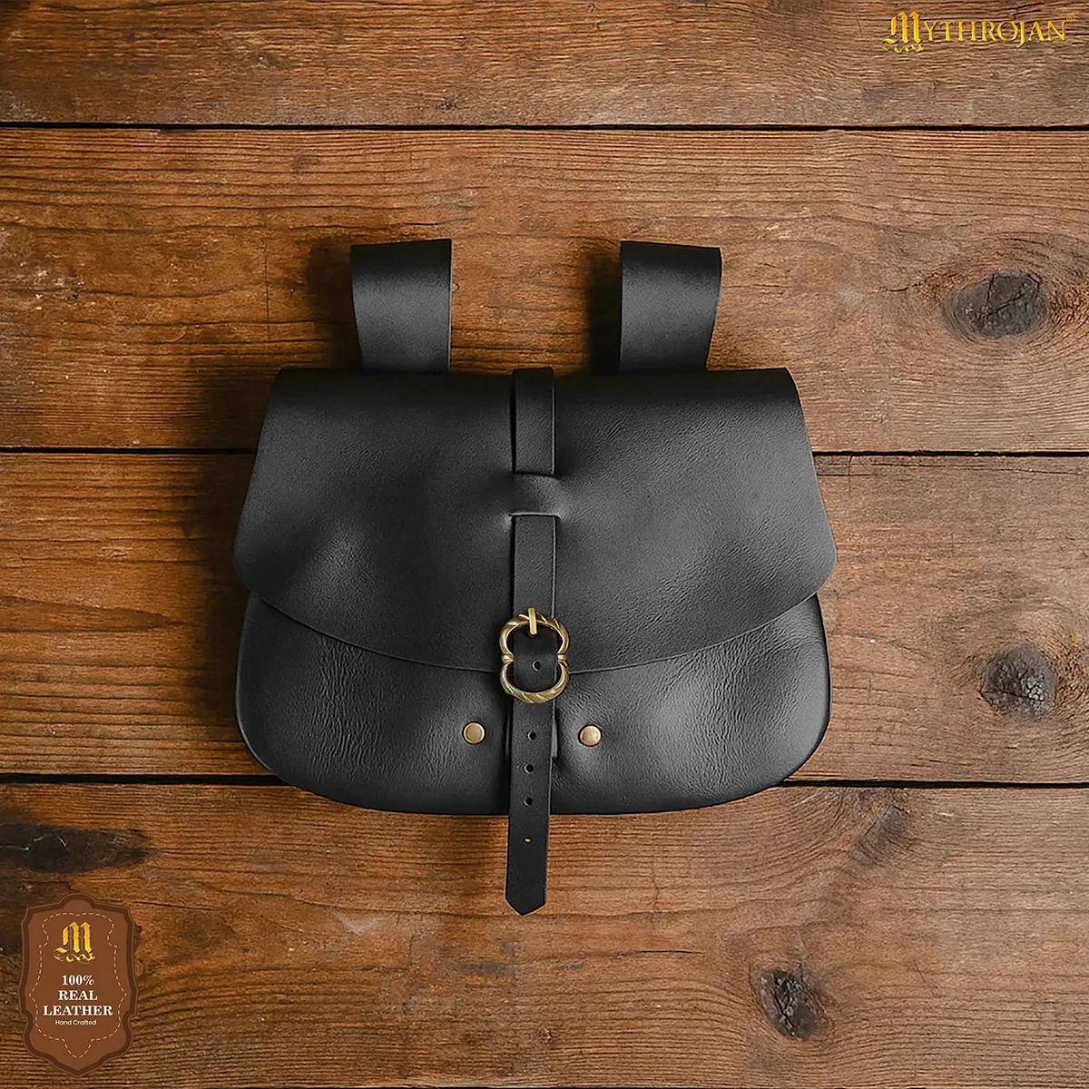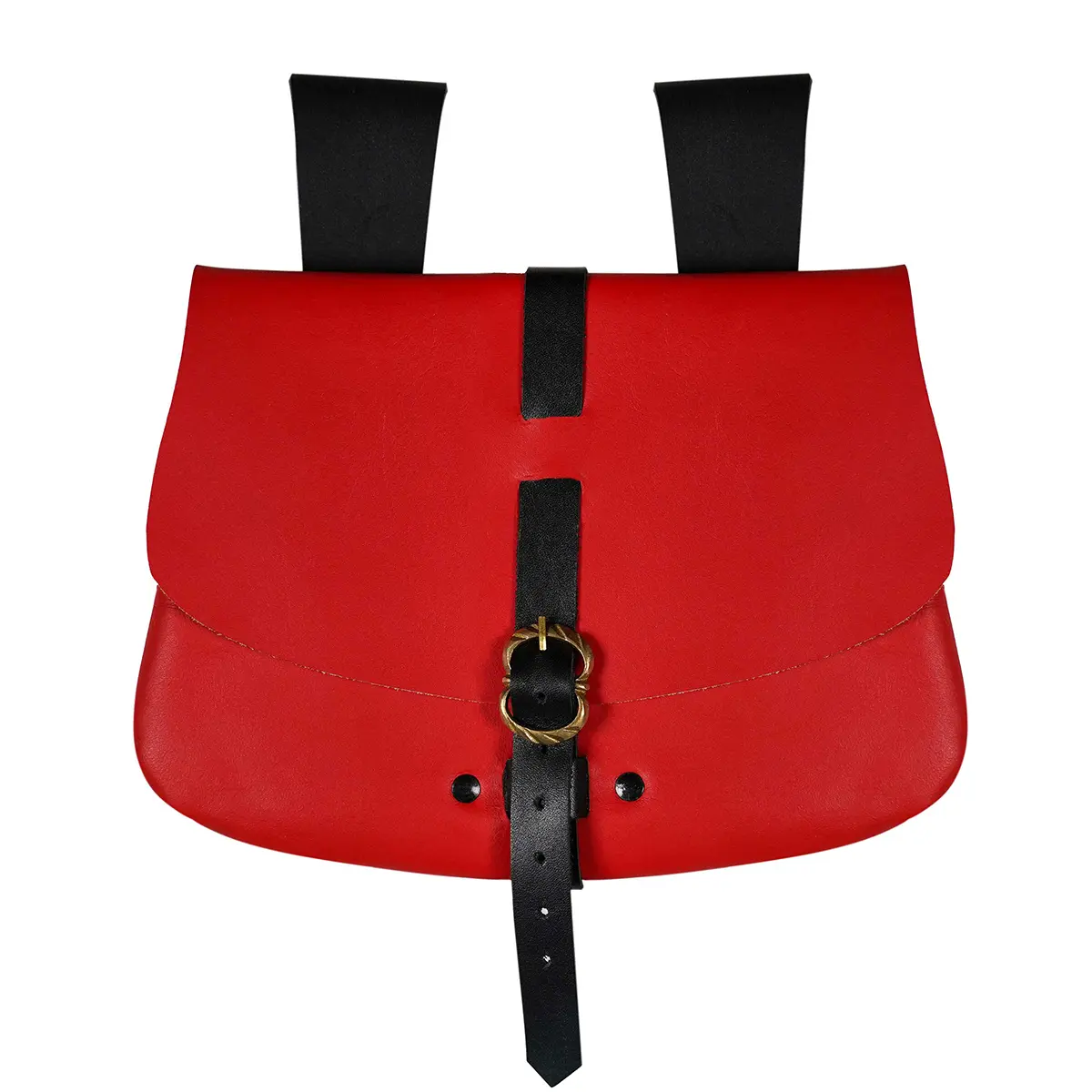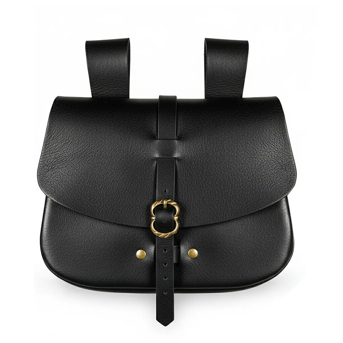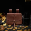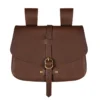 The sturdy brass buckle closure, reinforced with rivets, keeps your belongings safe while adding a rustic medieval charm. Wide leather loops on the back allow the pouch to hang securely from belts up to 6.5 cm wide, making it versatile for both reenactment gear and everyday outfits.