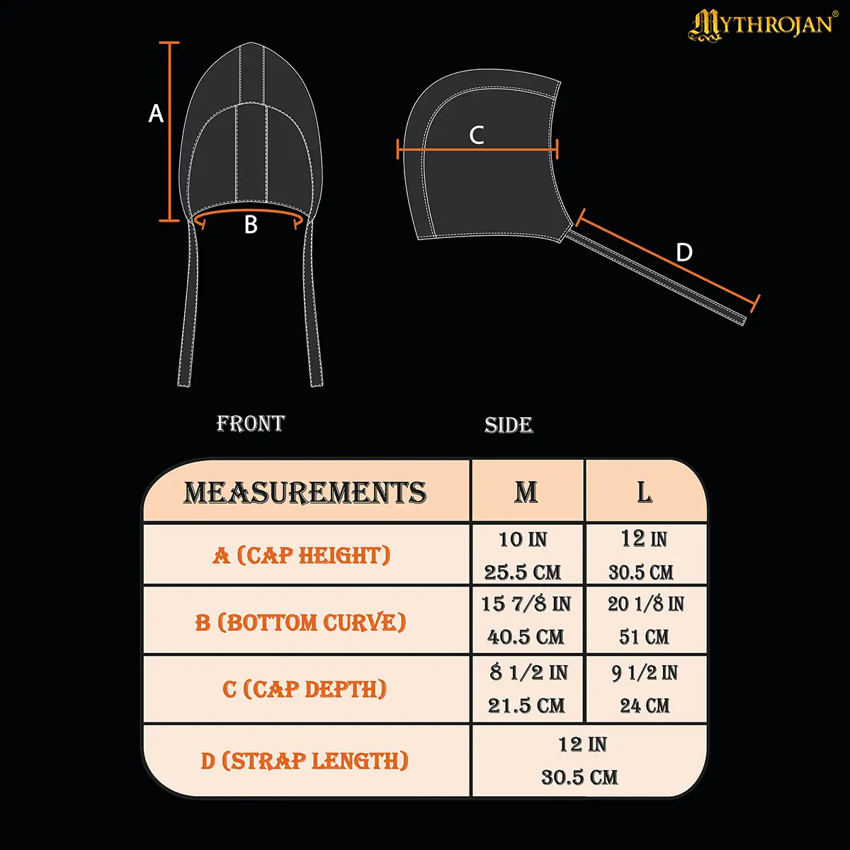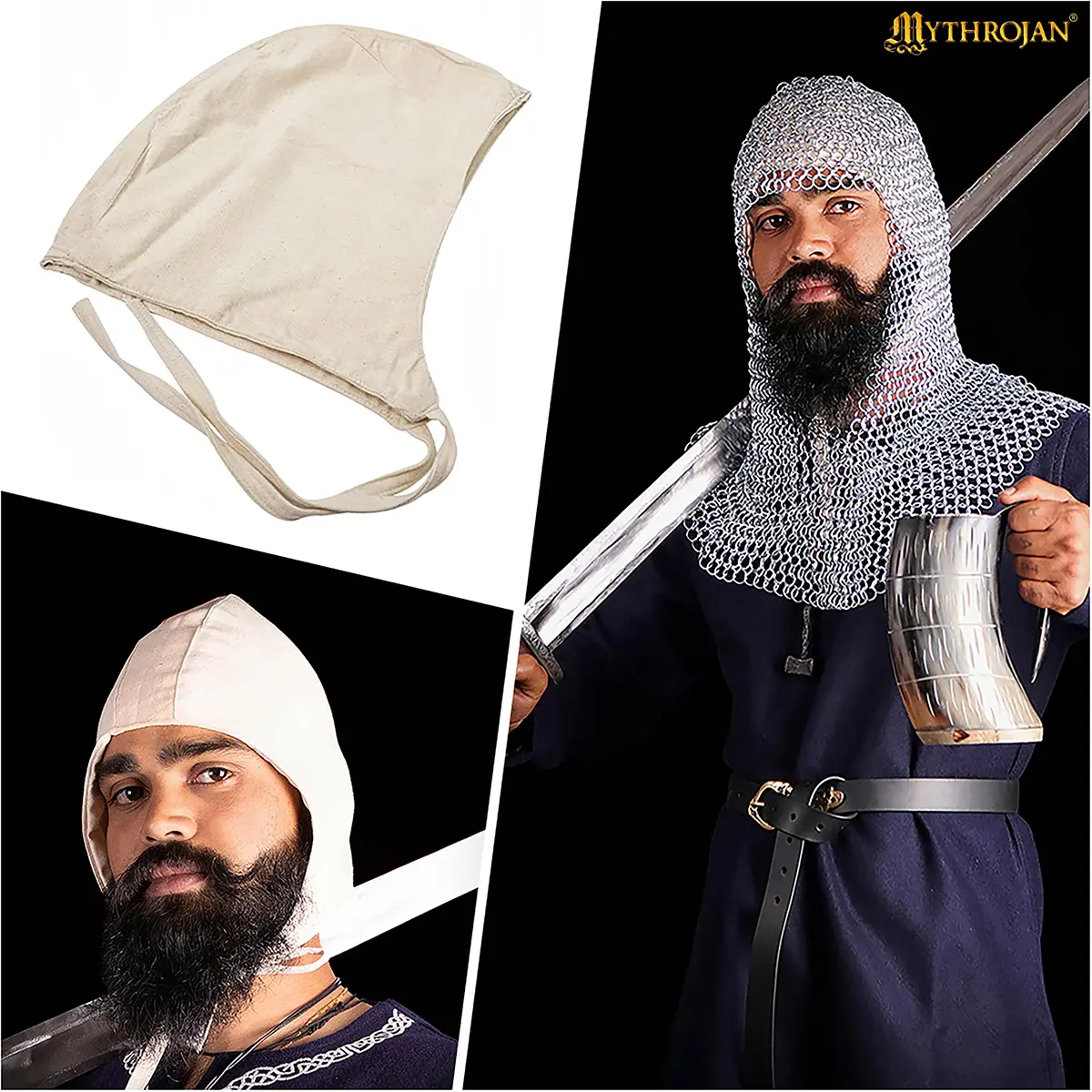 Designed with two front drawstrings, this coif can be securely tied under the chin for a snug, adjustable fit, keeping it in place even during movement or combat. The drawstrings also add a touch of authenticity, showing the fastening style used in real medieval headwear.