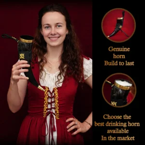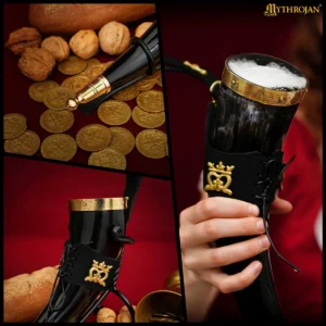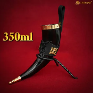Mythrojan THE ELEGANT LADY Viking Drinking Horn with Black Leather holder Authentic Medieval Inspired Viking Wine/Mead Mug – Polished Finish