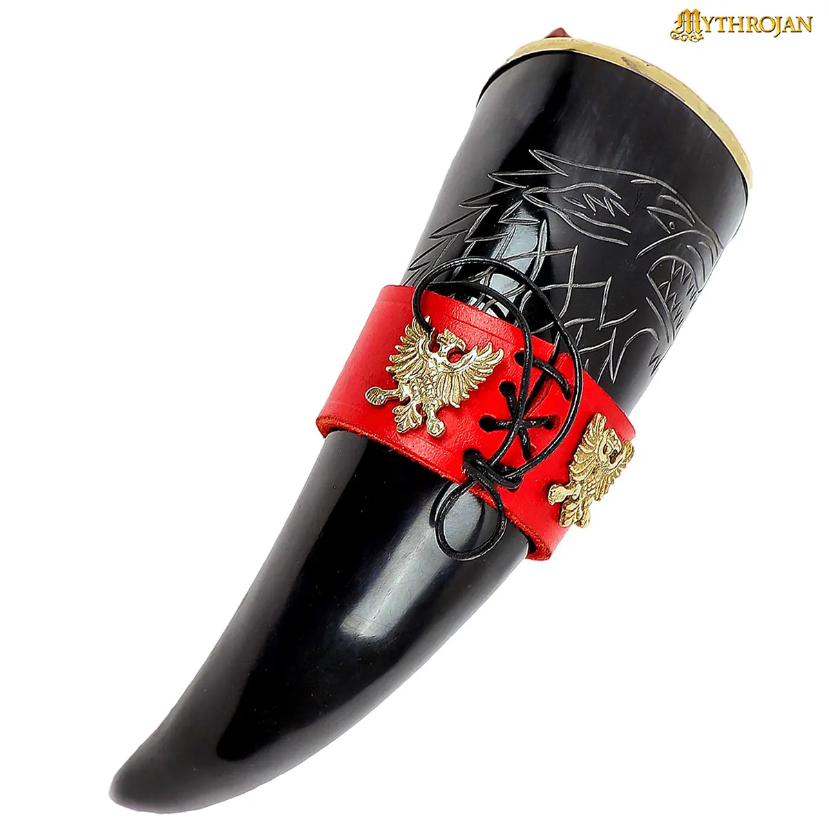 Each horn is artfully designed, embodying the mystique of ancient times when warriors and kings would sip from similar vessels, symbolizing strength and valor. Enhanced by a stunning red leather holder, the King of the North Drinking Horn is not only a conversation starter but also a practical solution to holding your drink securely. Whether you are hosting a themed party, attending a renaissance fair, or just enjoying a quiet evening at home, this drinking horn transforms your drinking experience into an extraordinary event.