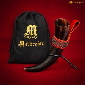 Elevate your drinking experience with the authentic Viking Drinking Horn, complete with a red leather holder. Perfect for enjoying your favorite mead or wine.