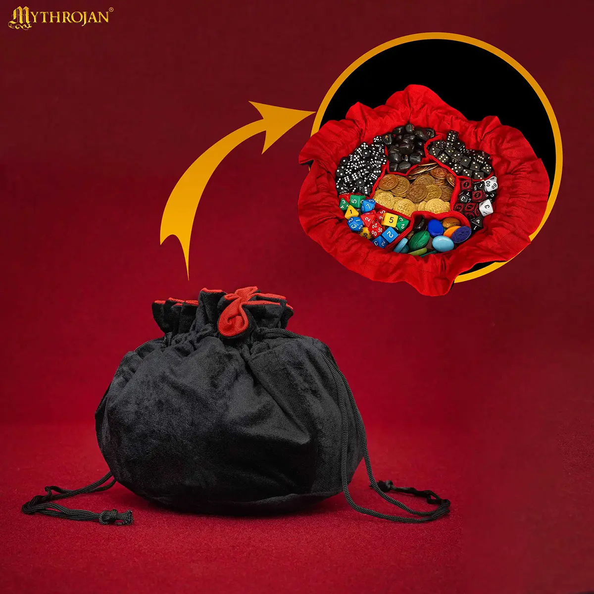 - HANDMADE FROM SOFT & RELIABLE FABRIC: We take great pride in the way our products are handcrafted using only the highest quality of materials available. The bag is carefully tailored with firmly sewn red canvas cotton on the inside, making up seven pouches to hold all your dice. The black velvet exterior makes it supple to touch giving it an eye-catching texture.