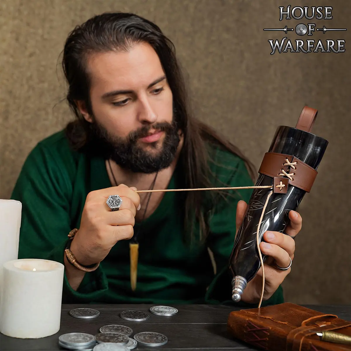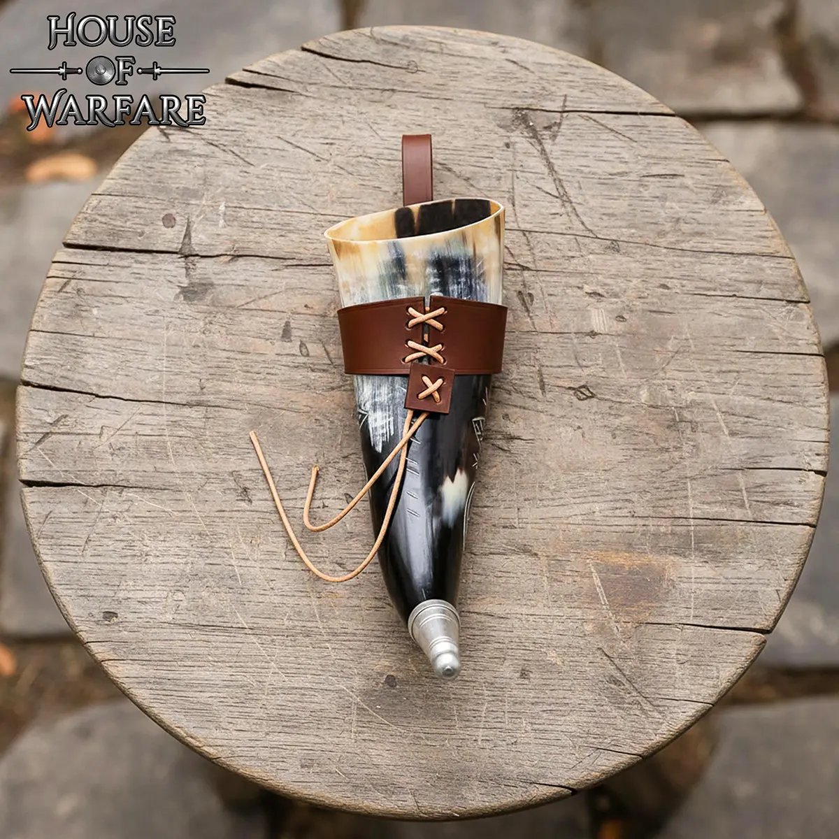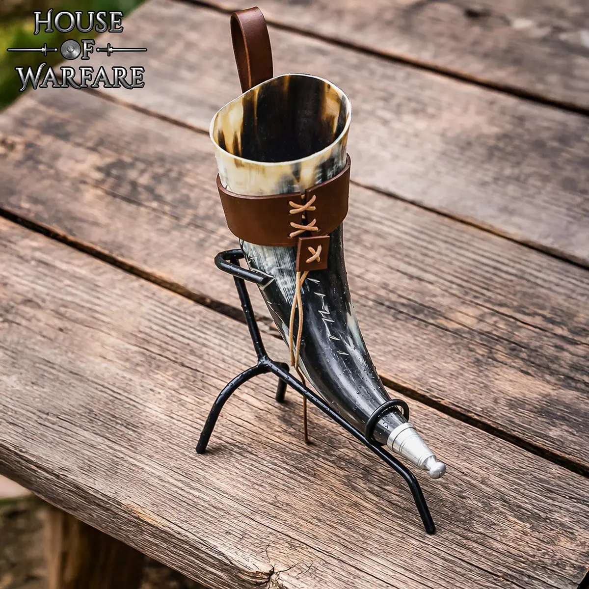 The norse drinking horn is paired with a genuine leather holder for practical use. The leather wrap secures the horn tightly from a lace cord and includes belt loops, so that you can hang it comfortably from your belt during events or travel.