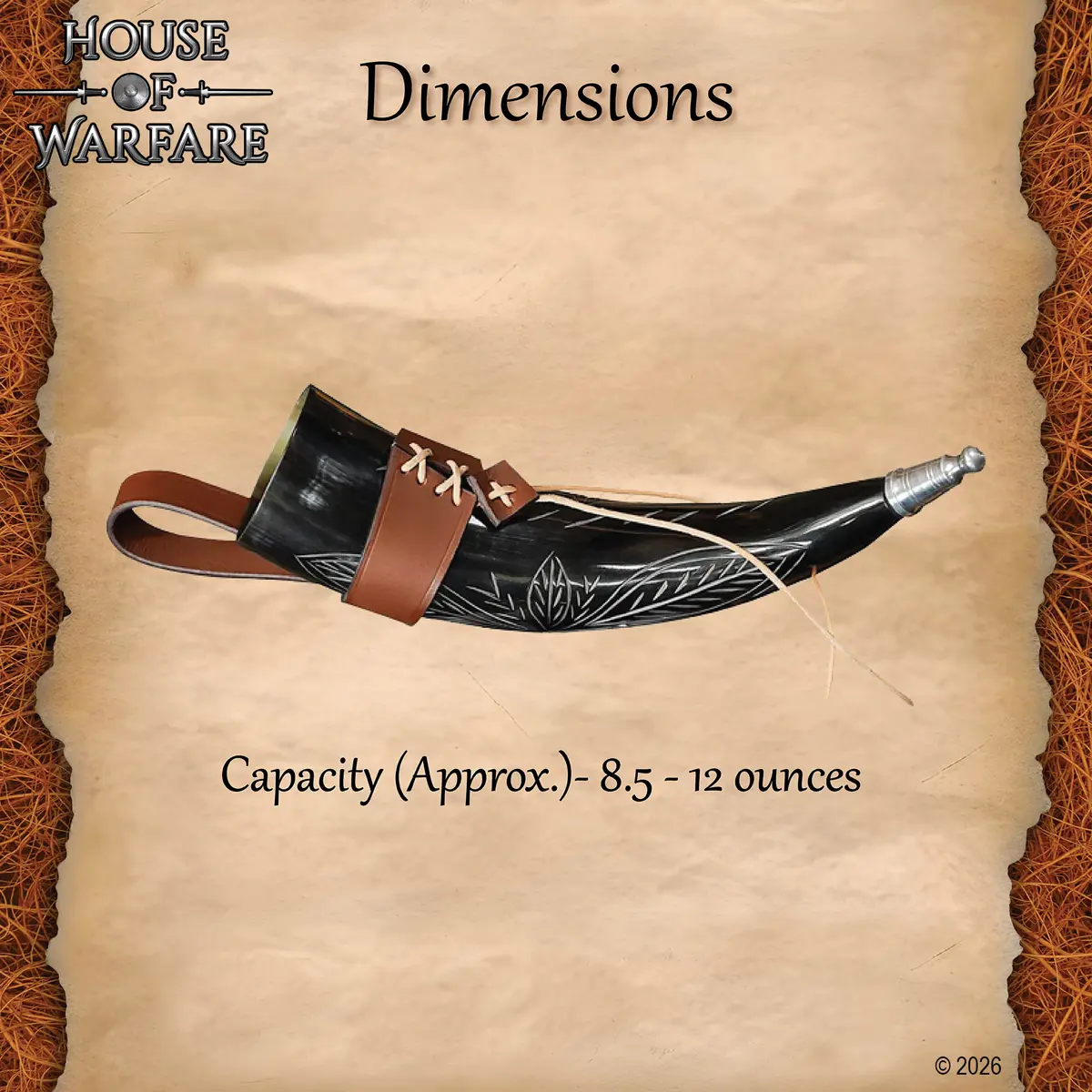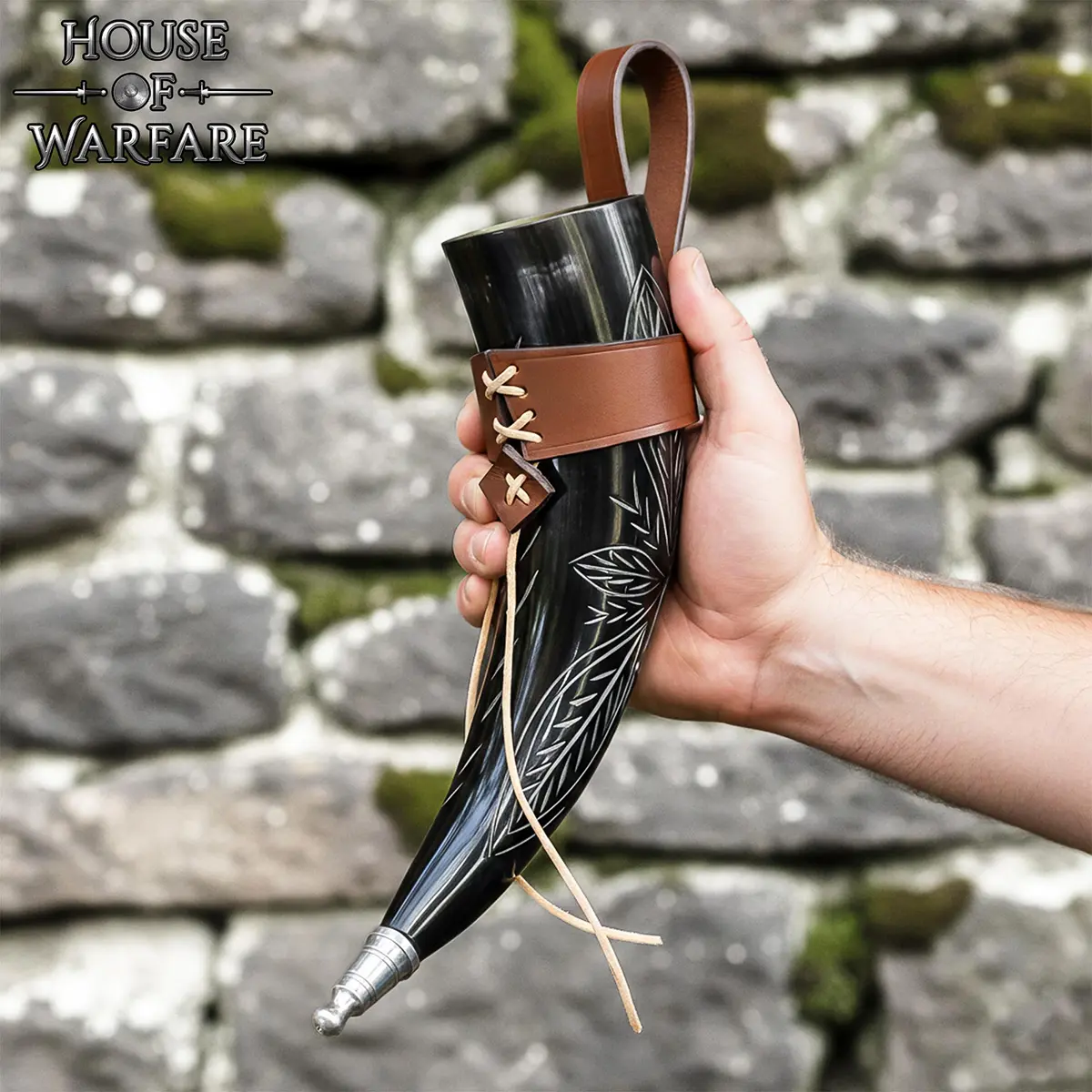 This horn has a capacity of approximately 8.5 – 12 ounces. has natural engraved detailing that follows the curve of the horn, giving it a bold look. The base has a lightweight aluminum tip that is rust-resistant and helps protect the horn while keeping the weight low.