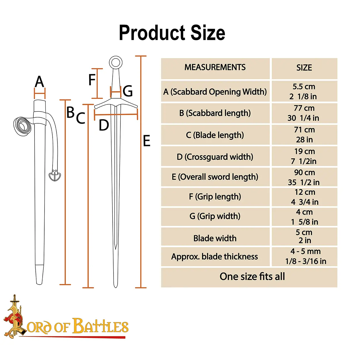The sword has a full-tang construction with a peened pommel, just like original medieval swords. This method gives more durability and keeps the sword well balanced. The smooth, polished finish gives it a clean and authentic appearance.
