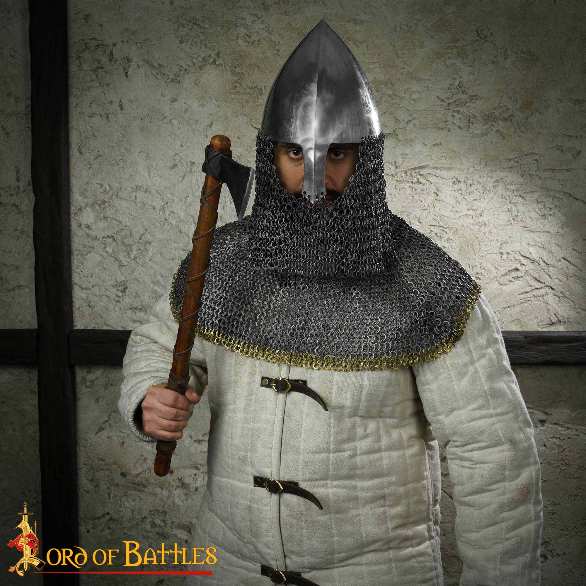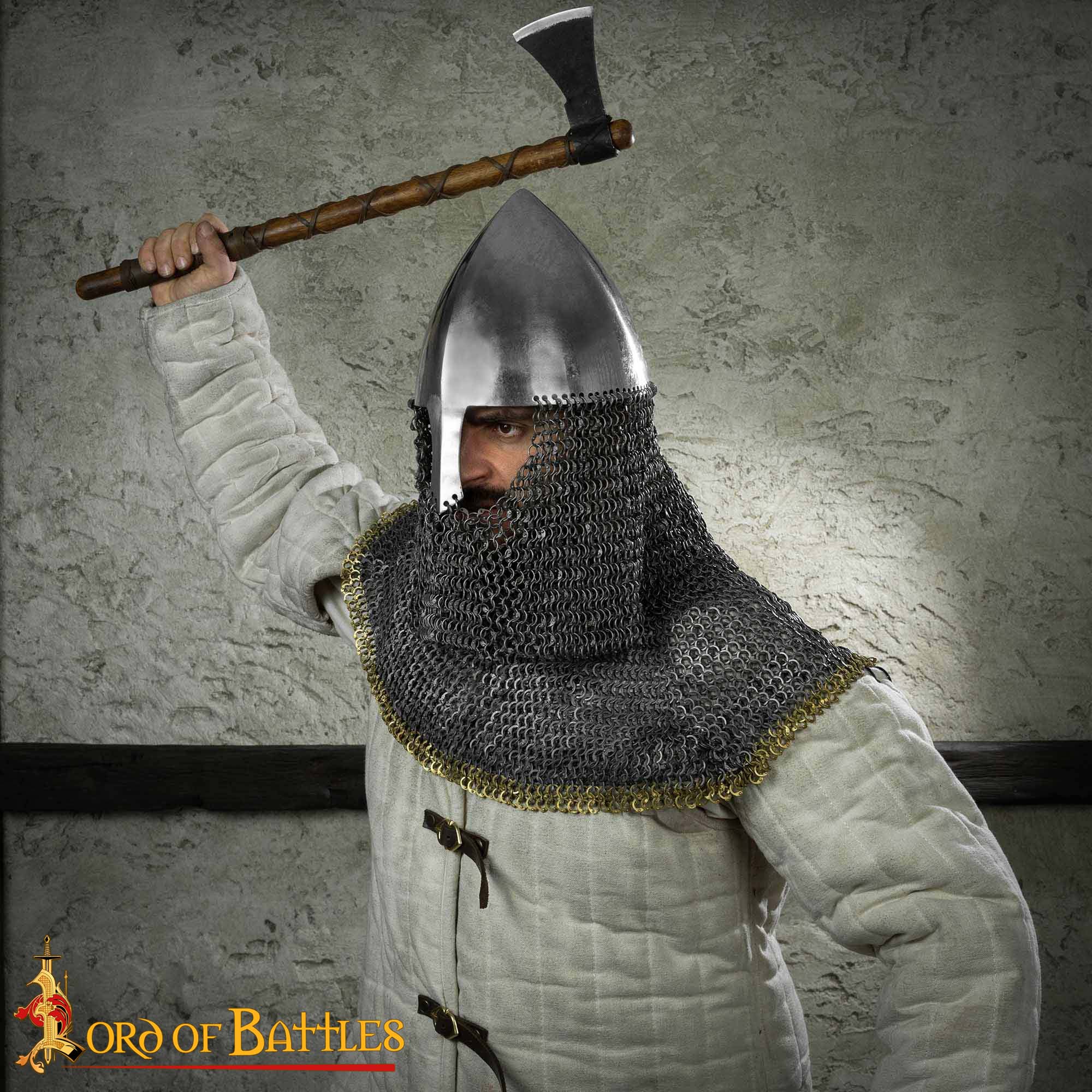 Imagine donning this helmet at your next LARP or historical reenactment. It pairs perfectly with our chainmail coifs (sold separately) and is suitable for a range of characters, from humble archers to mighty knights. The helmet is designed for comfort, featuring a leather liner that secures it snugly on the head, ensuring that you remain comfortable even in intense situations. It has a circumference of 68 cm, making it a versatile fit for various head sizes.