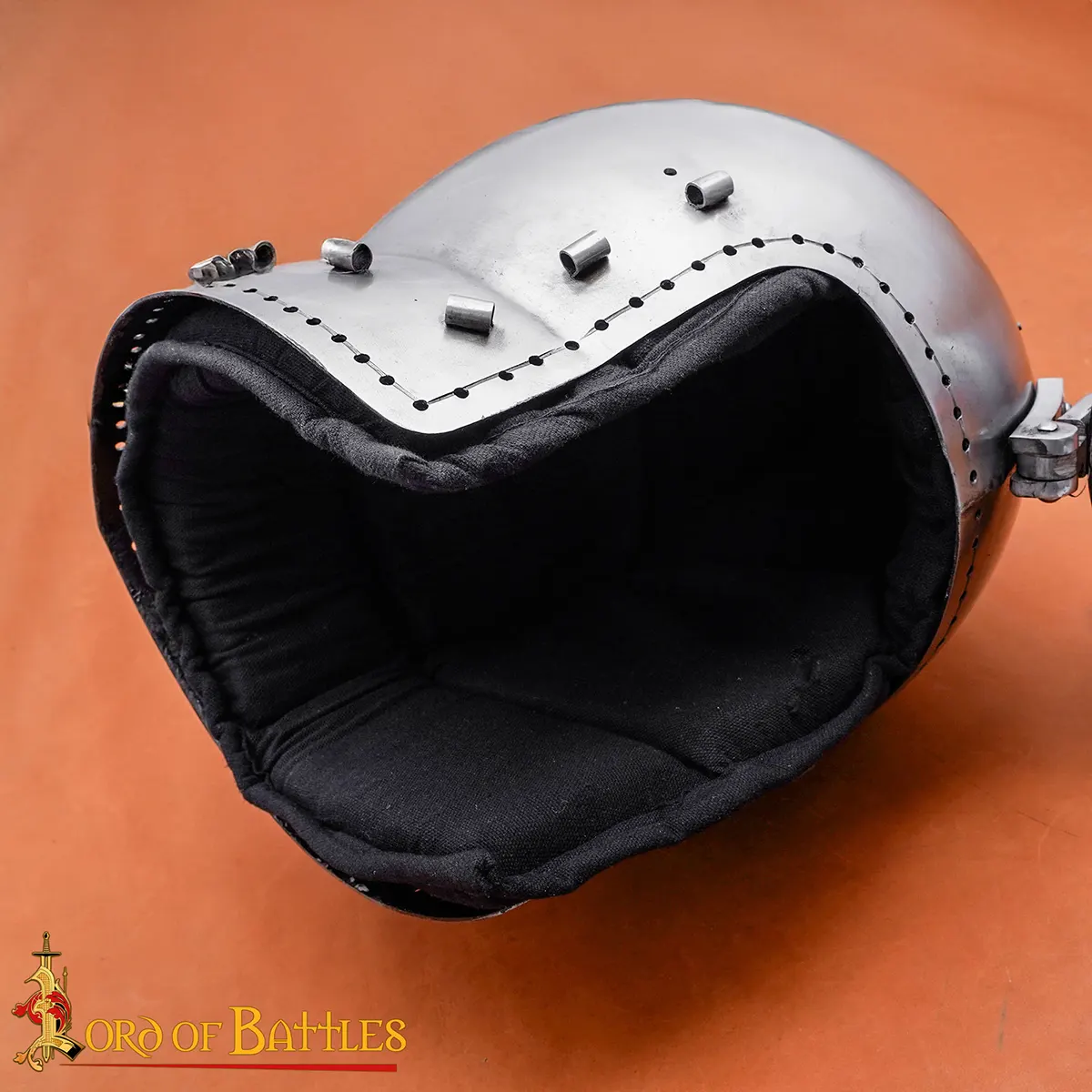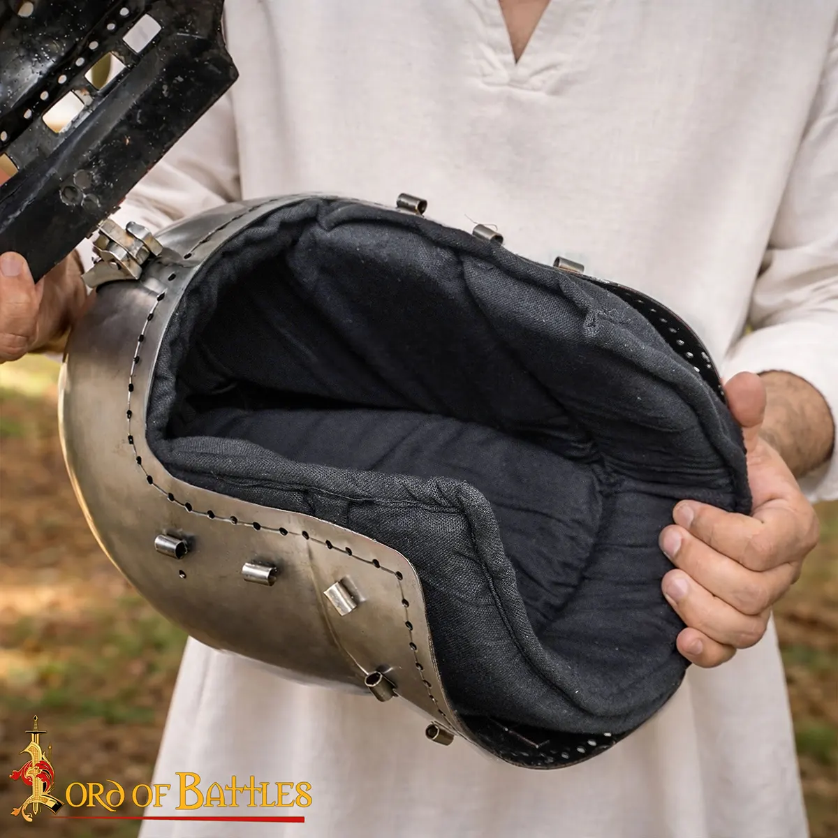 This bascinet helmet liner also functions as a medieval arming cap, making it suitable for LARP, stage use, and training. The padding stays in place and helps keep the helmet stable during use. It also acts as effective helmet padding, especially when worn for extended periods.