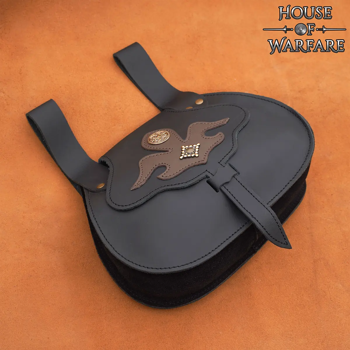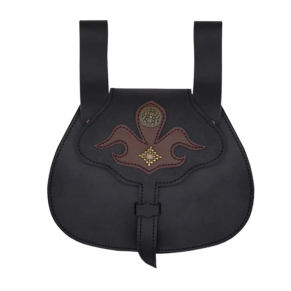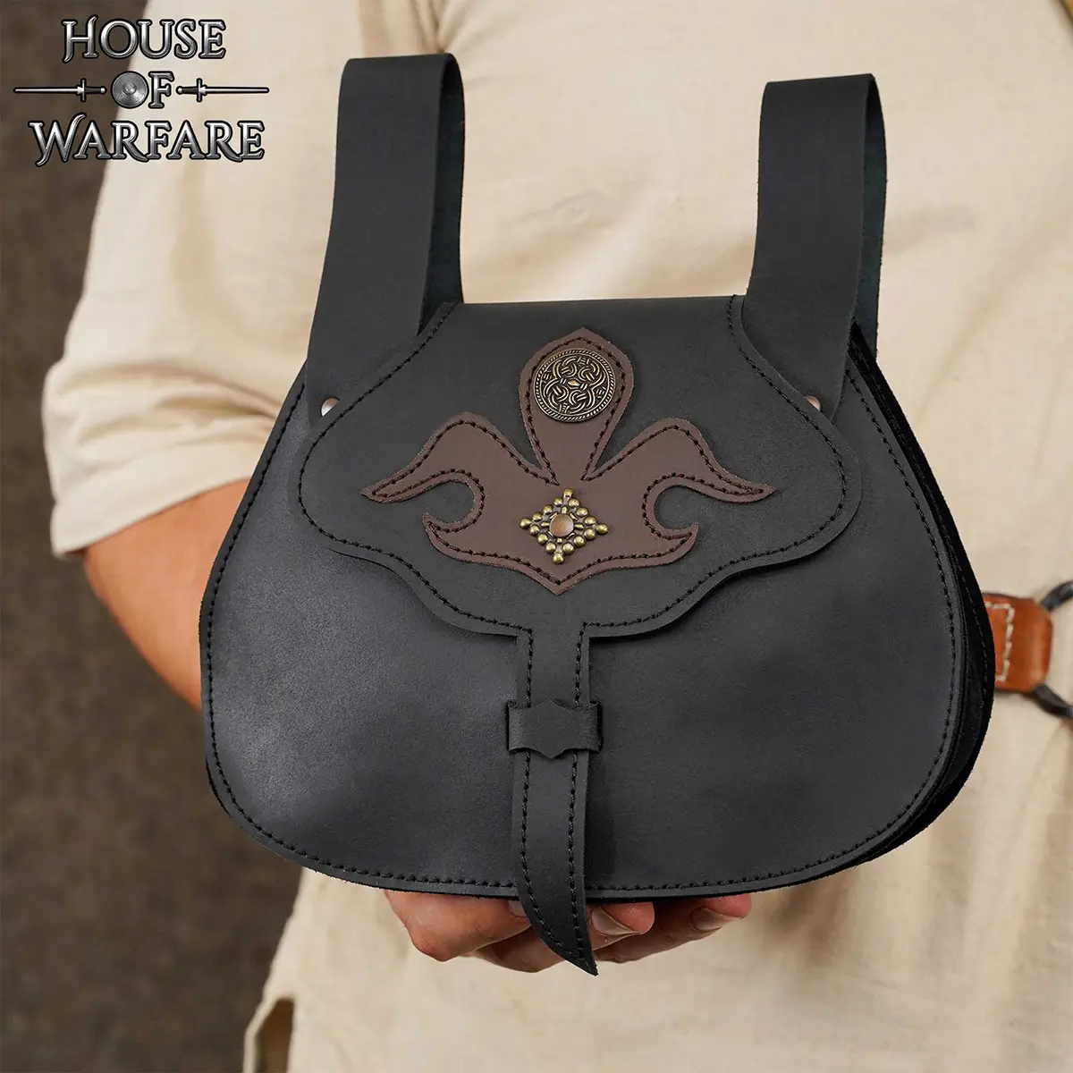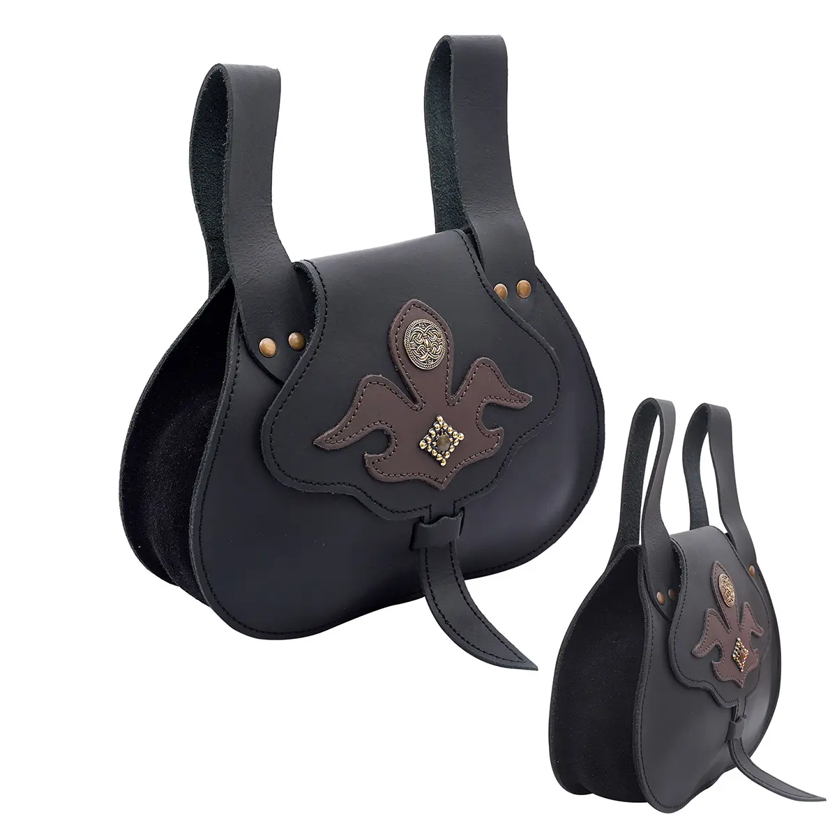 The main body is handcrafted from 2-2.2 mm thick genuine leather, with a rounded shape with a lobed front flap. The flap closes securely with a traditional strap and loop fastening system, keeping your essentials safe. A contrasting fleur-de-lis appliqué decorates the flap, cut from 1 mm thick soft brown leather and accented with antique brass studs and a knotwork medallion for more visual depth.