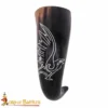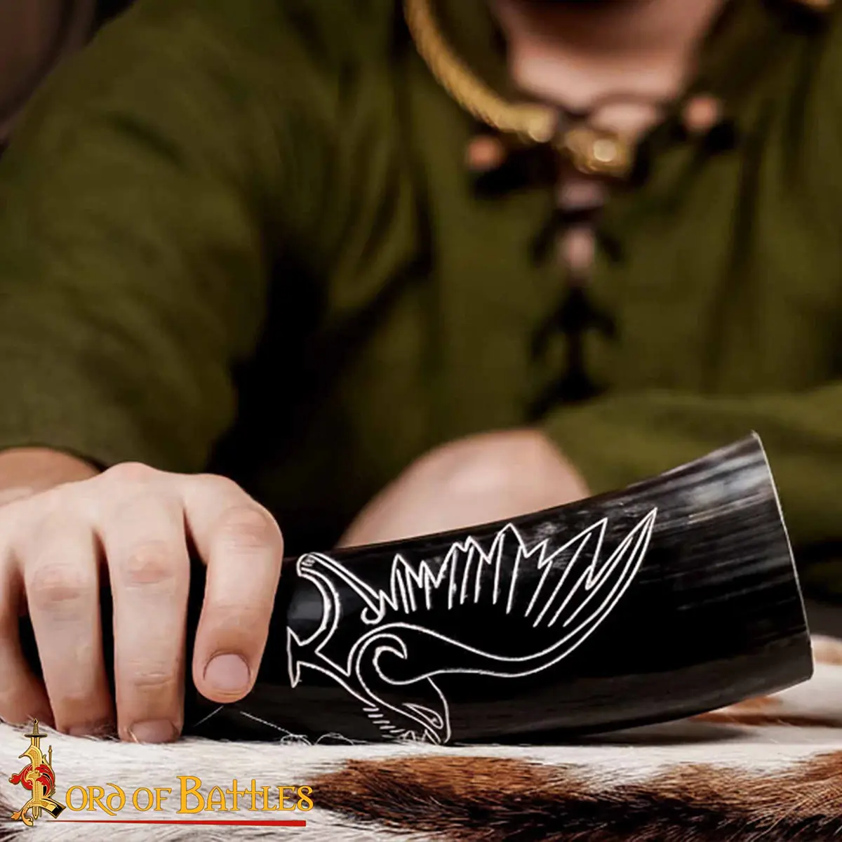 This horn drinking cup has a beautifully engraved raven, a bird deeply respected in Norse mythology. To the Vikings, the raven meant wisdom protection, and watchful presence of the gods. It was believed to carry messages between the human world and the divine. Each time you raise this horn, you hold Viking belief and spirit in your hands.